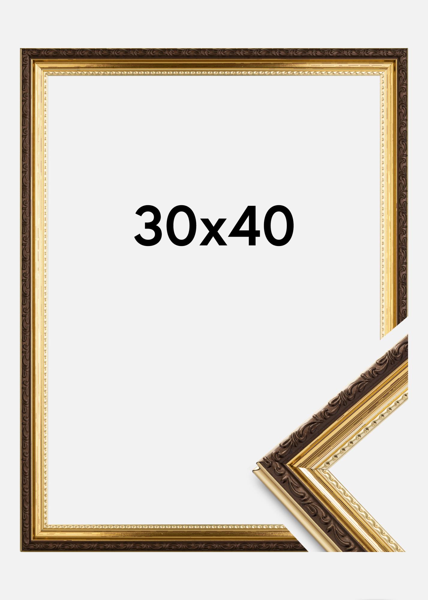 Looking for a beautifully decorated frame in a vintage style? Abisko Acrylic Glass Gold is a sturdy gold frame with unbelievably elegant detailing. The frame is 25mm wide and has a glossy gold colour with ornate brown edging. The vintage look is accentuated by an elegant wave pattern closest to the glass.