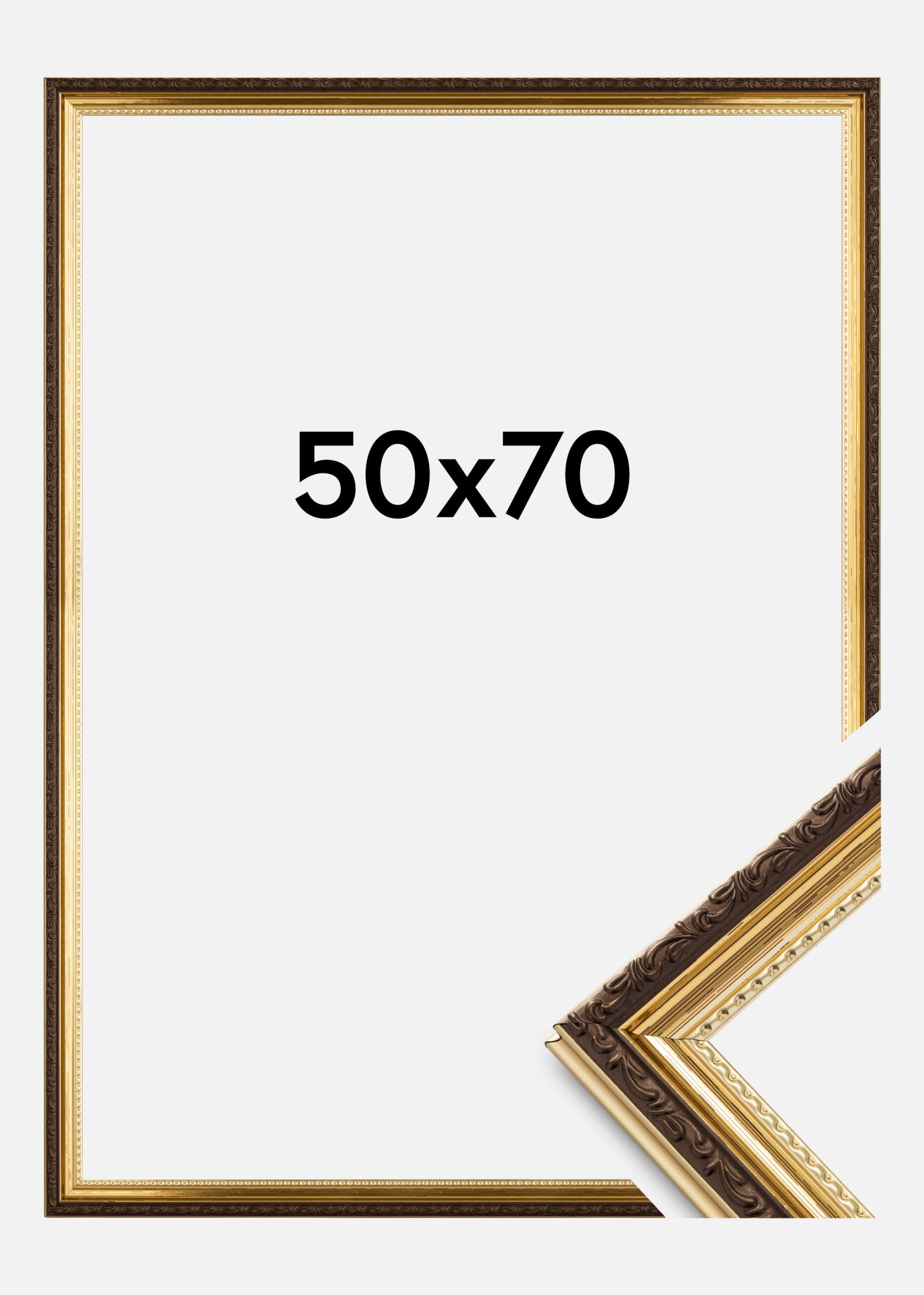 Looking for a beautifully decorated frame in a vintage style? Abisko Acrylic Glass Gold is a sturdy gold frame with unbelievably elegant detailing. The frame is 25mm wide and has a glossy gold colour with ornate brown edging. The vintage look is accentuated by an elegant wave pattern closest to the glass.