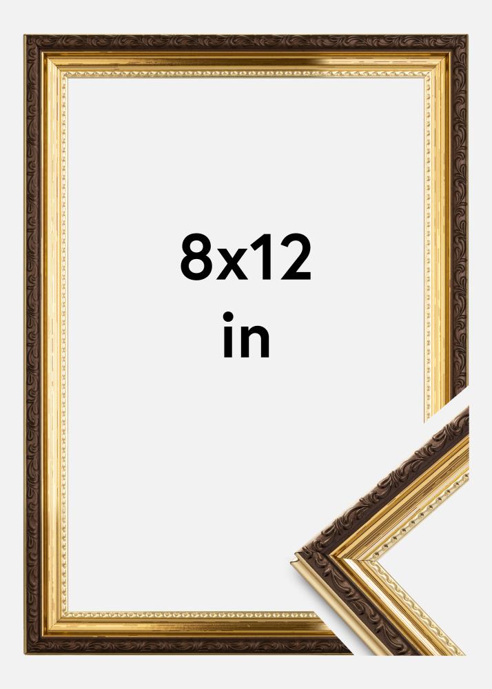 Looking for a beautifully decorated frame in a vintage style? Abisko Acrylic Glass Gold is a sturdy gold frame with unbelievably elegant detailing. The frame is 25mm wide and has a glossy gold colour with ornate brown edging. The vintage look is accentuated by an elegant wave pattern closest to the glass.