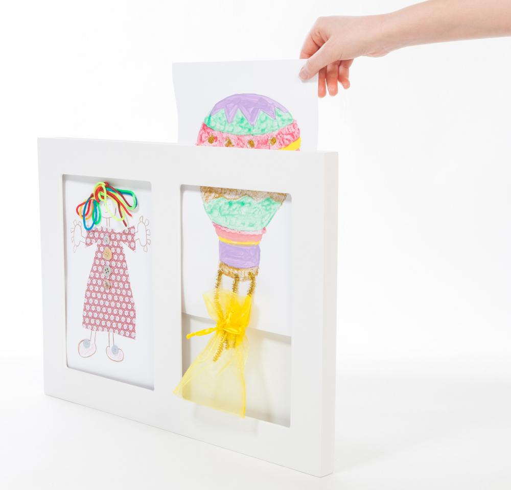 Stylish frame for A4 artwork. Let your child's creativity flow and display their artwork in their very own gallery. The white wooden frame has a practical wall bracket and can be hung both portrait and landscape. The frame holds two drawing in A4 which can be easily switched as new artwork is created.
