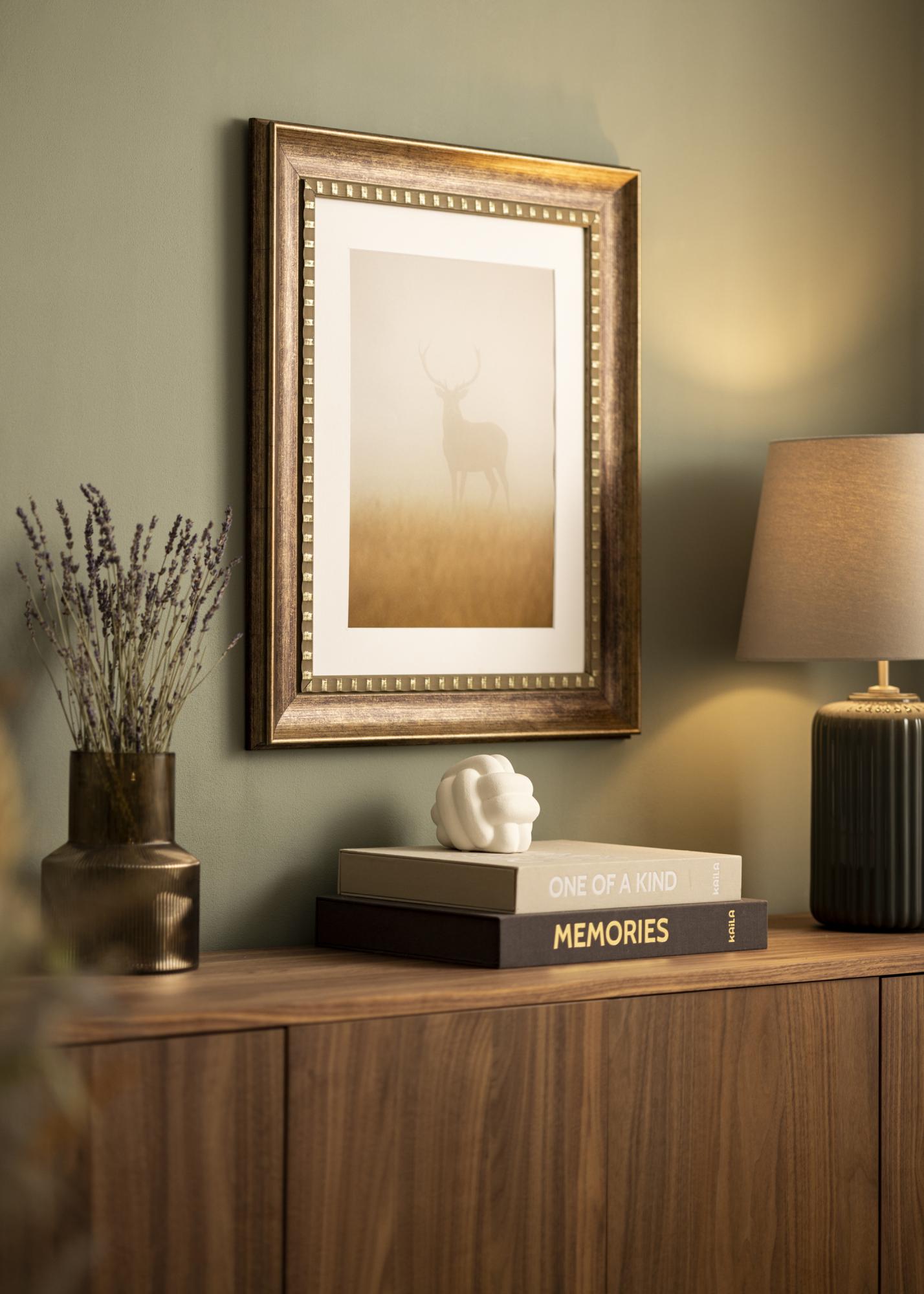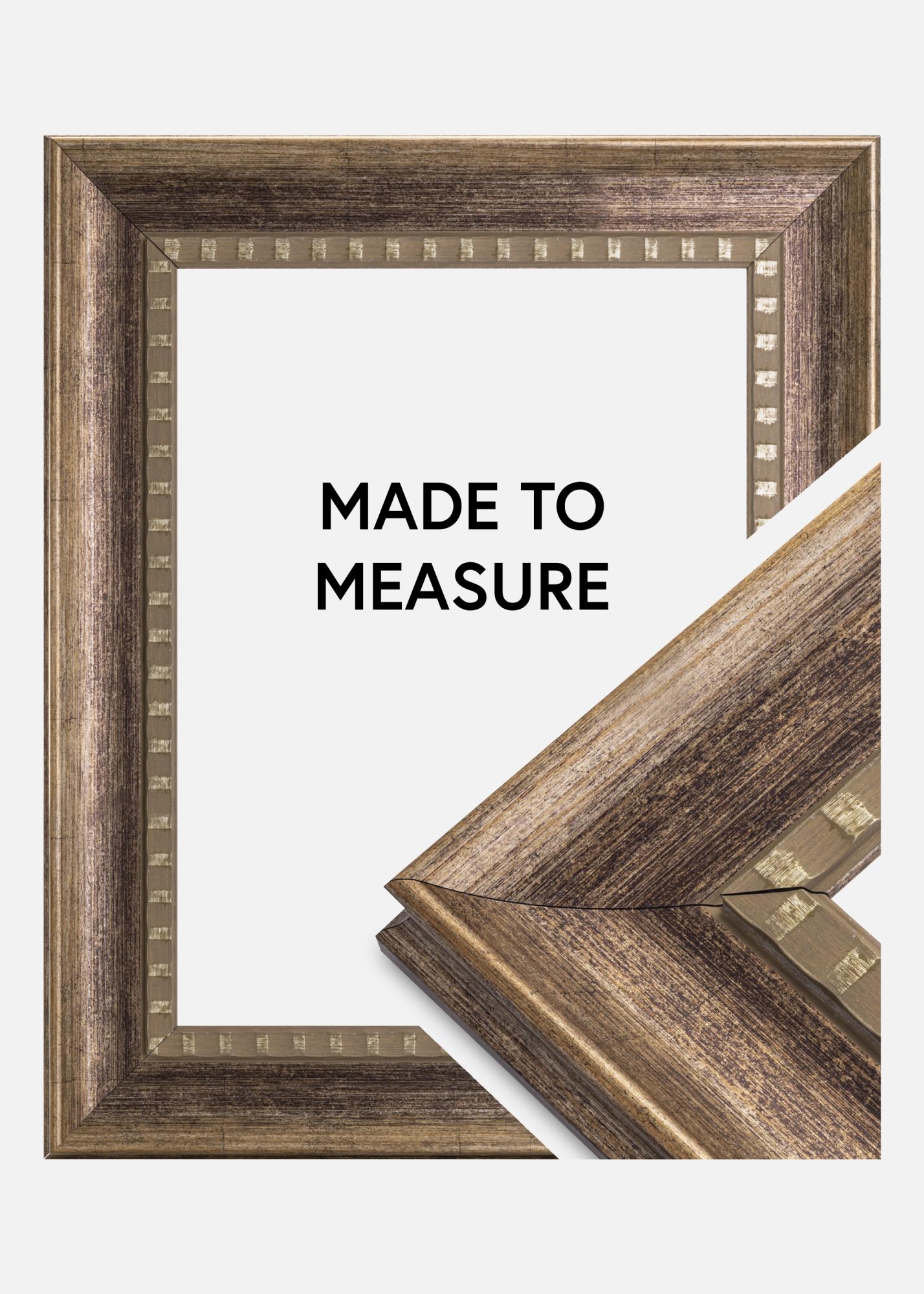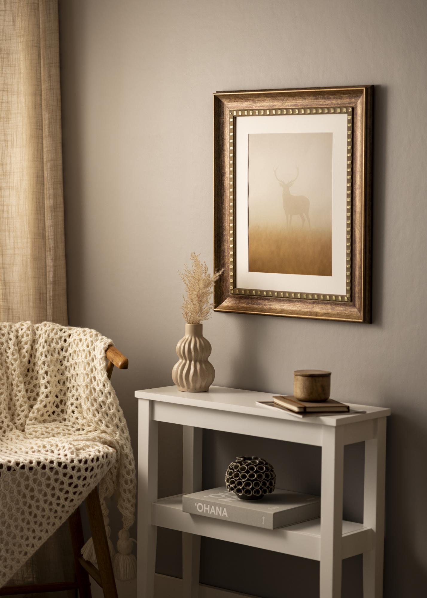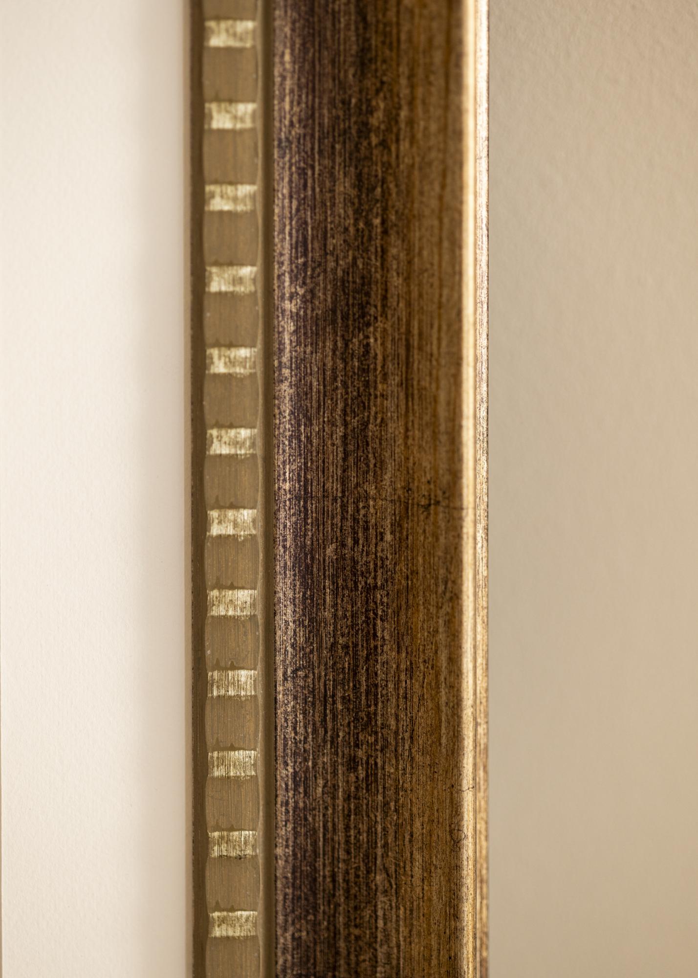 Camden Silver has a warm brown color with a subtle antique finish that gives it a rustic character. The surface is provided with a light graining that mimics natural wood, enhancing its vintage expression. The decorative inner edge is adorned with small, regular gold-colored details that create an elegant contrast against the darker wood tone. The outer edge has a soft chamfer with a discreet gold finish, giving the photo frame a luxurious and timeless feeling.