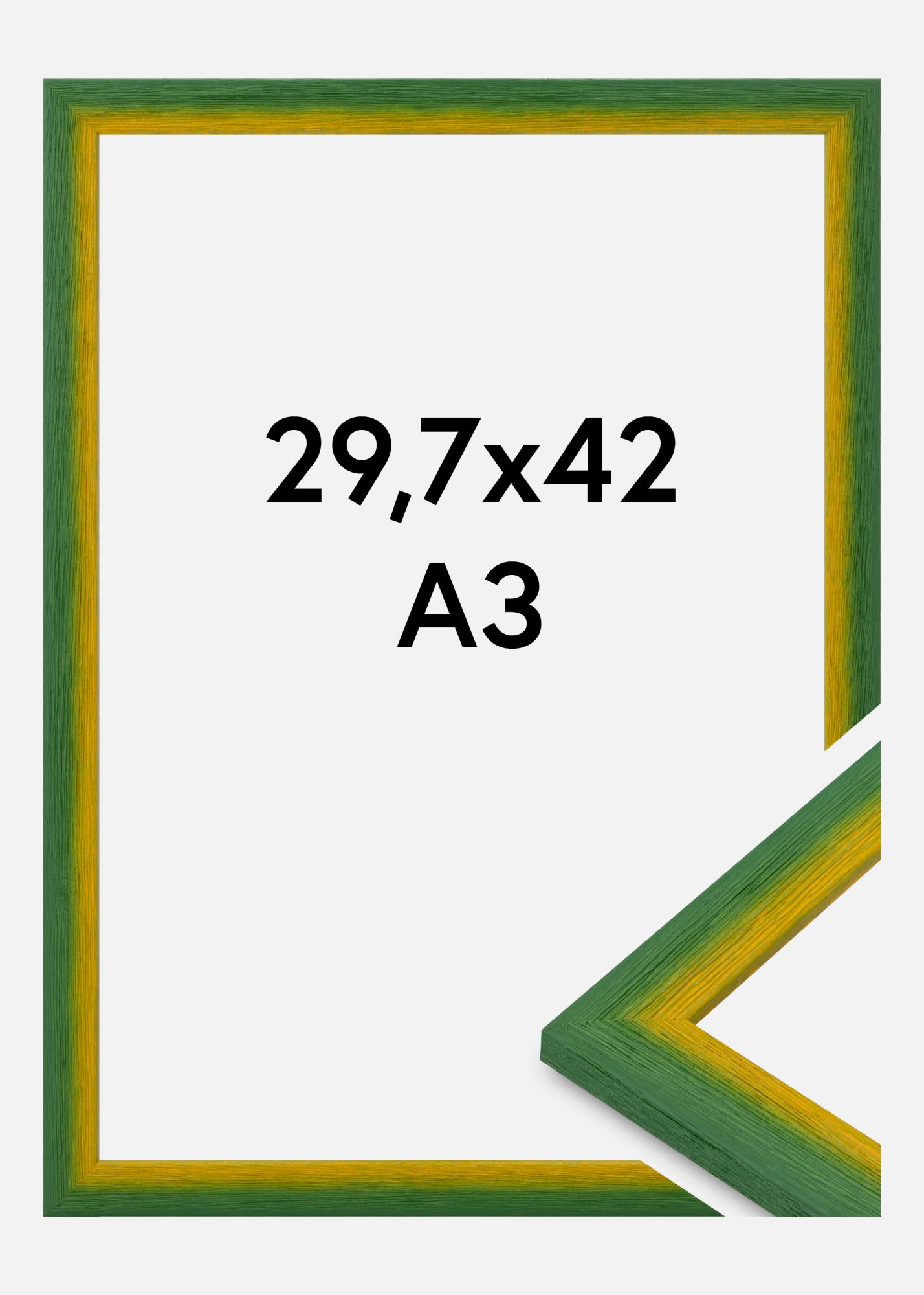 This photo Frame in the size 29.7x42 cm is a perfect blend of modern design and natural beauty. With its smooth surface and harmonious mix of Green and golden Yellow tones, it highlights the natural texture of the wood in an elegant way. The slim profile, with a Frame edge of 23 mm and a depth of 13 mm, gives a clean and understated look that lets your artwork take centre stage.