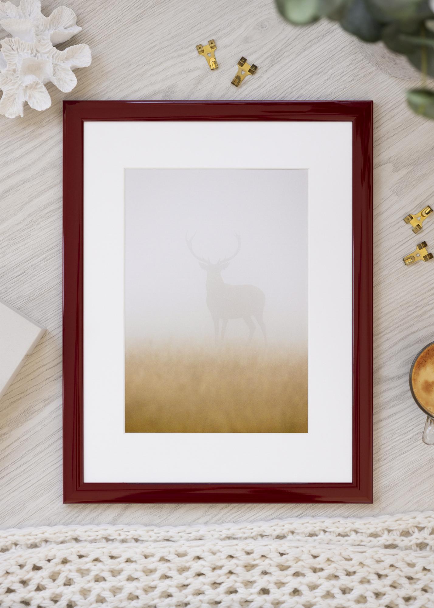 This photo Frame in the size 21x29.7 cm is perfect for highlighting your favourite images. With a deep wine Red tone and a glossy finish, it gives a modern and stylish impression. The Frame has a slim profile with a 23 mm wide Frame edge and a depth of 13 mm, creating a minimalist look where your image truly takes centre stage.