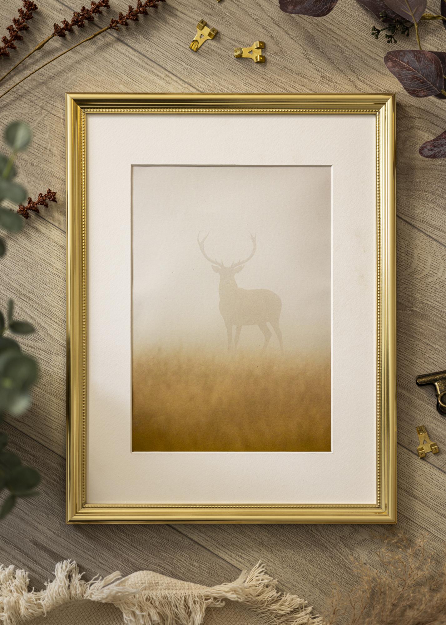 Give your photos a touch of classic elegance with our 13x18 cm gold frame. This photo frame is perfect for showcasing your favorite photos or artwork with its glossy finish and retro-style profiled frame. With a frame width measuring 20 mm, it adds a subtle yet distinct edge to your image.