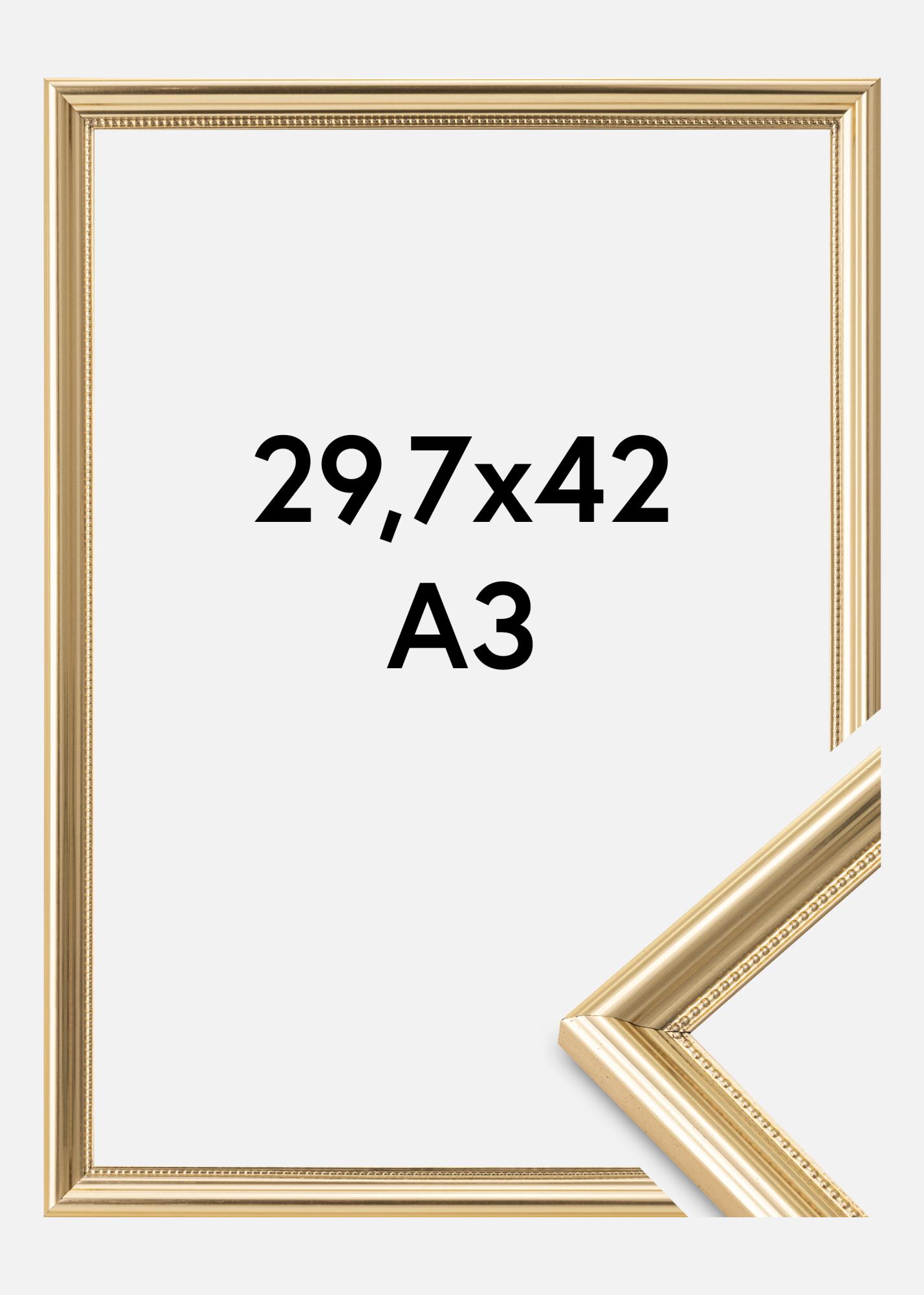 Give your walls a touch of elegance with this 29.7x42 cm (A3) gold-colored photo frame. With its profiled retro-style frame, it adds a classic charm to your home. The frame's width of 20 mm and depth of 17 mm provide a distinct and refined edge to your favorite pictures or artwork.