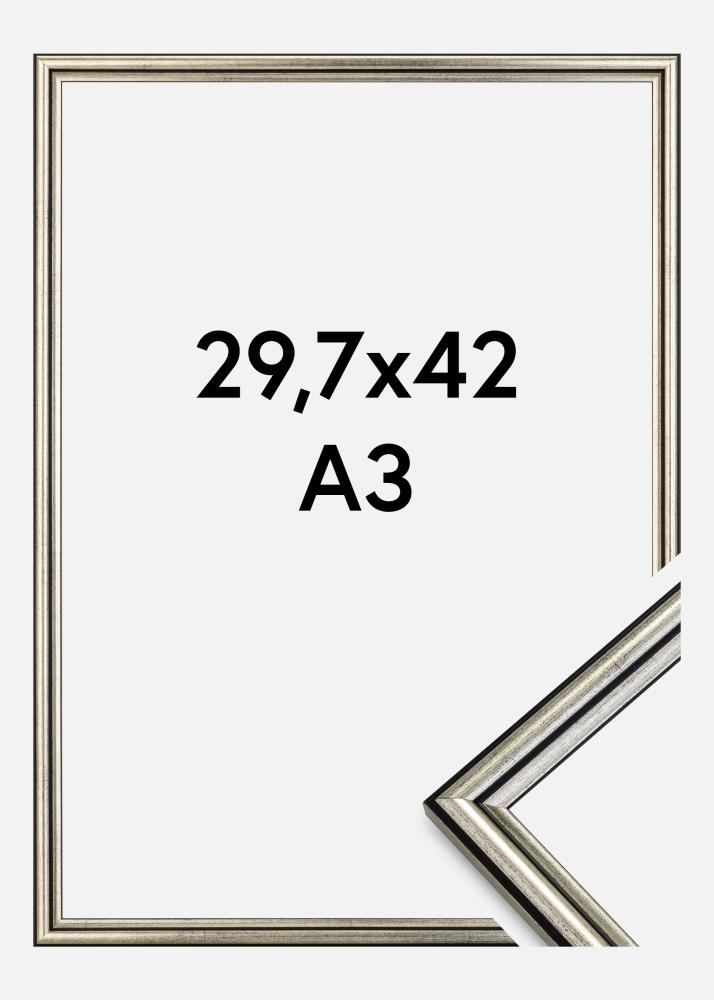 Discover the elegance and modern design of our 29.7x42 cm (A3) silver frame, perfect for showcasing your favorite artwork or photographs. This photo frame is a sleek combination of silver hues with subtle black specks and black lines, creating a sophisticated impression.