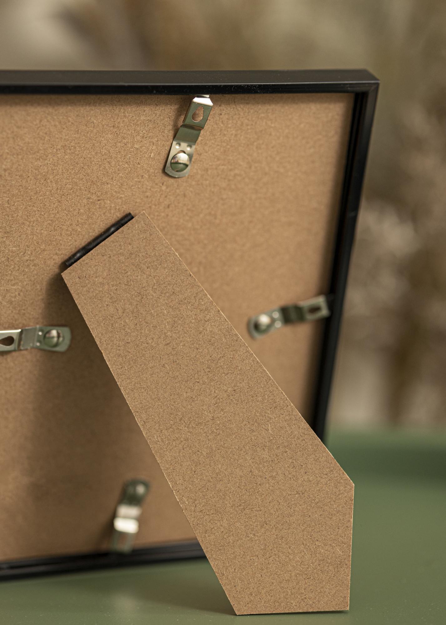 This picture frame is made from composite and fitted with acrylic glass. Acrylic glass is a type of acrylic plastic which is both lightweight and impossible to break. The back of the frame is made from MDF. To remove the back panel and insert your pictures into the frame, simply rotate the clips that hold the back panel in place.