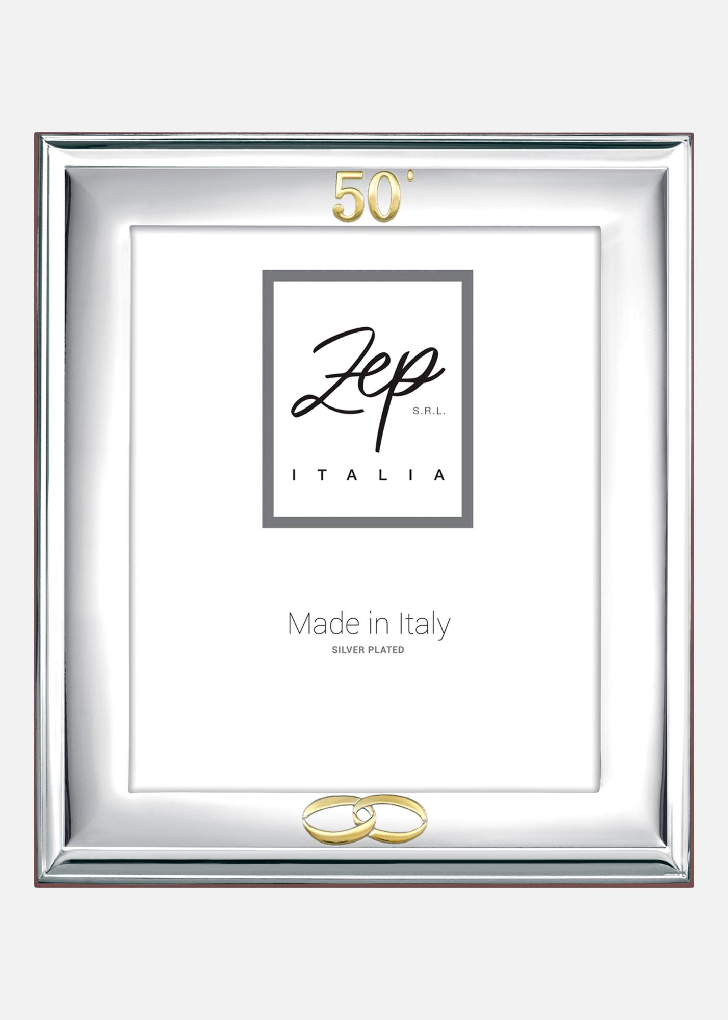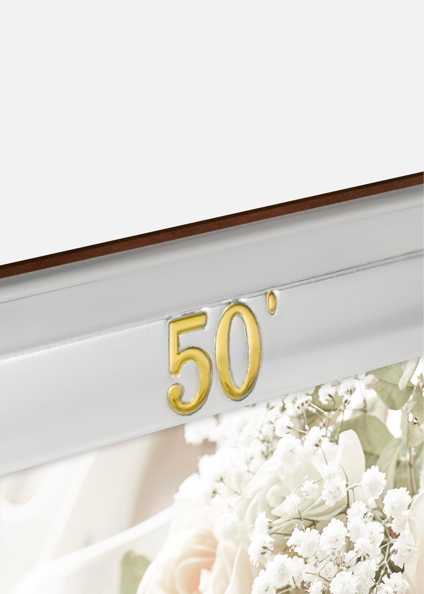 Celebrate half a century of love with an elegant silver-colored metal frame that showcases your most beautiful memories. This 15x20 cm photo frame is adorned with symbolic details representing your 50-year marriage, including the classic numbers '50' and two charming gold wedding rings on the frame's border.