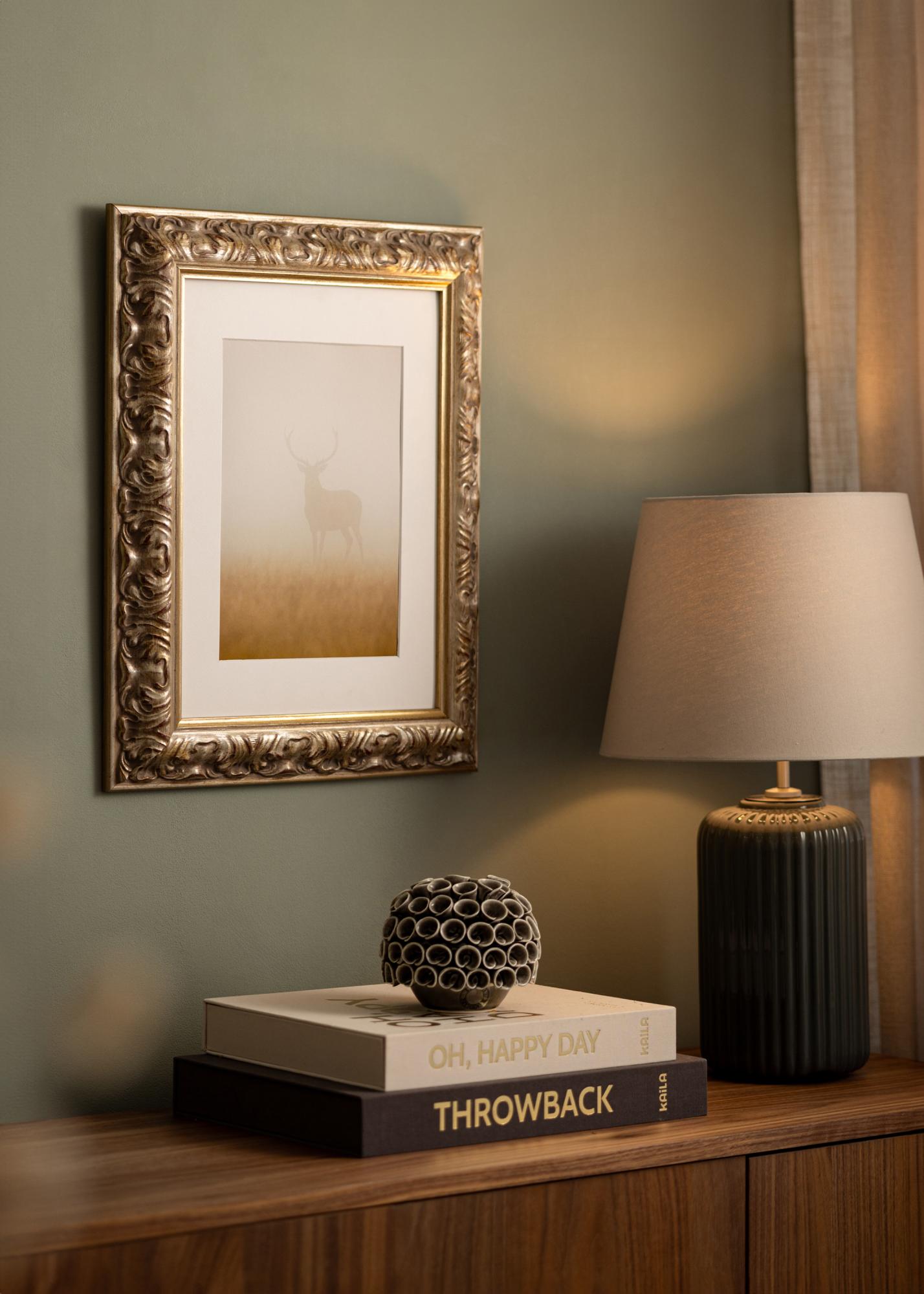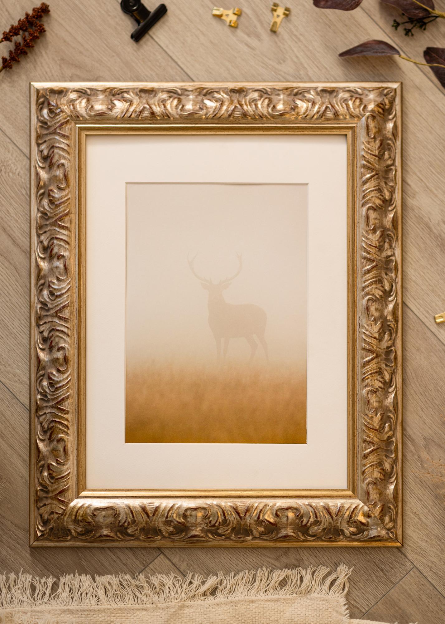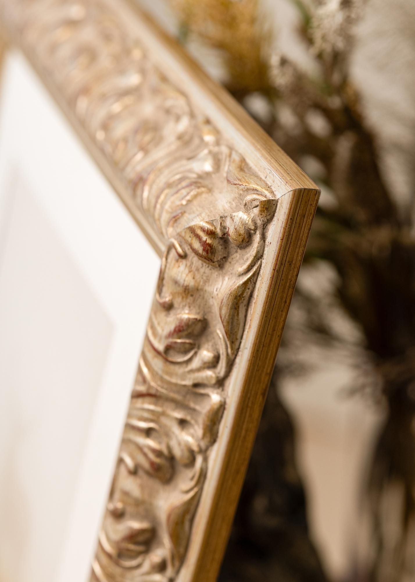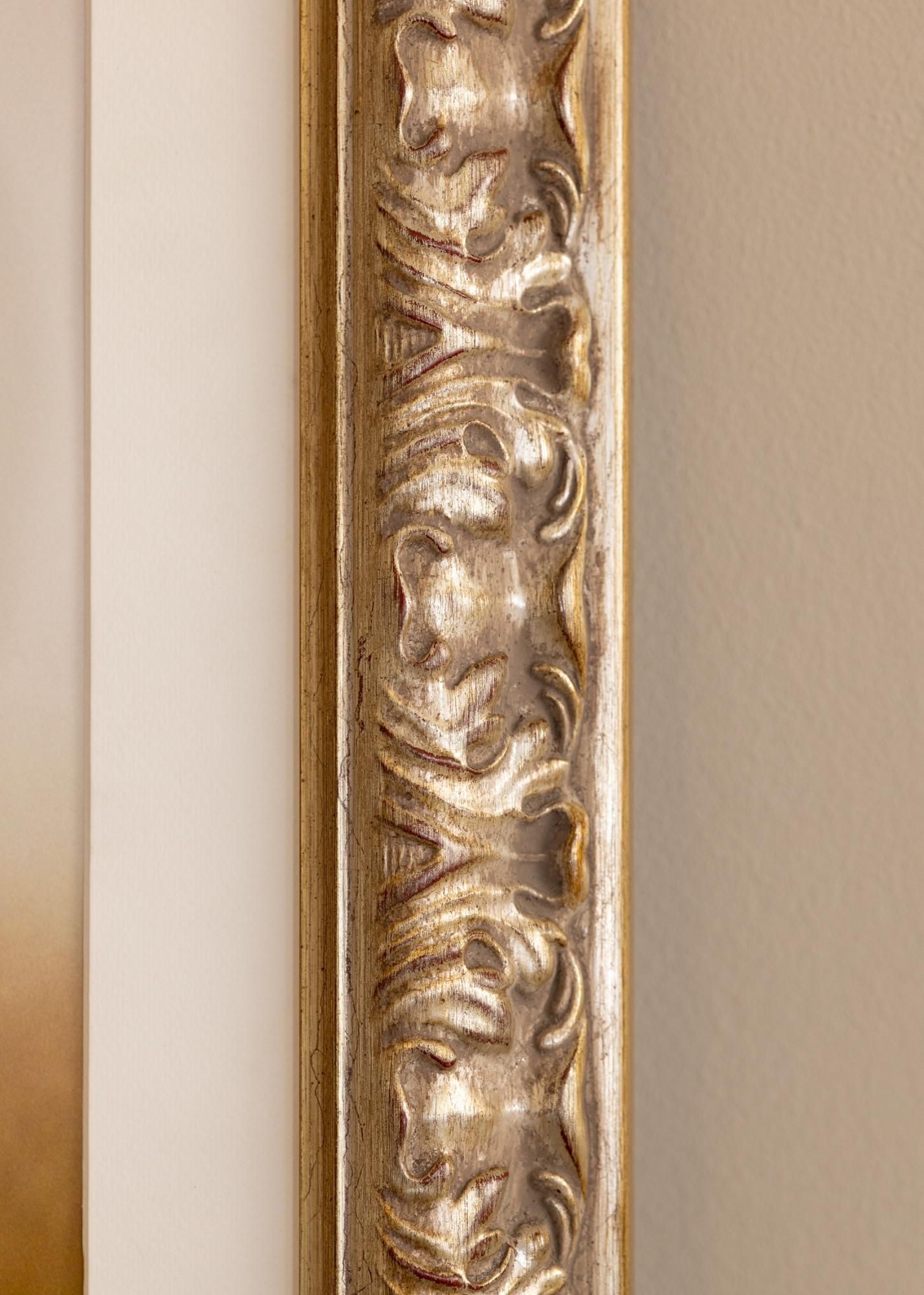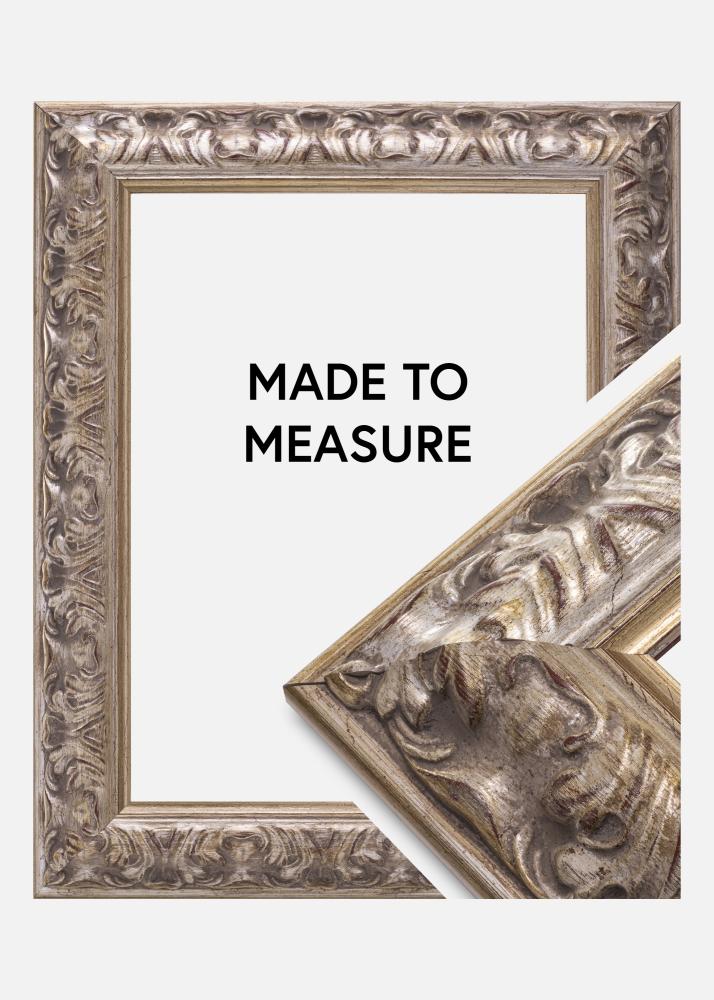 Frame Odin Silver is a custom-sized photo frame that offers a perfect combination of elegance and functionality. With its antique silver finish, subtle gold details, and discreet red elements, this photo frame provides a classic and sophisticated expression that enhances any artwork or photograph. The decorative design makes it ideal for framings where an elegant feel is desired.