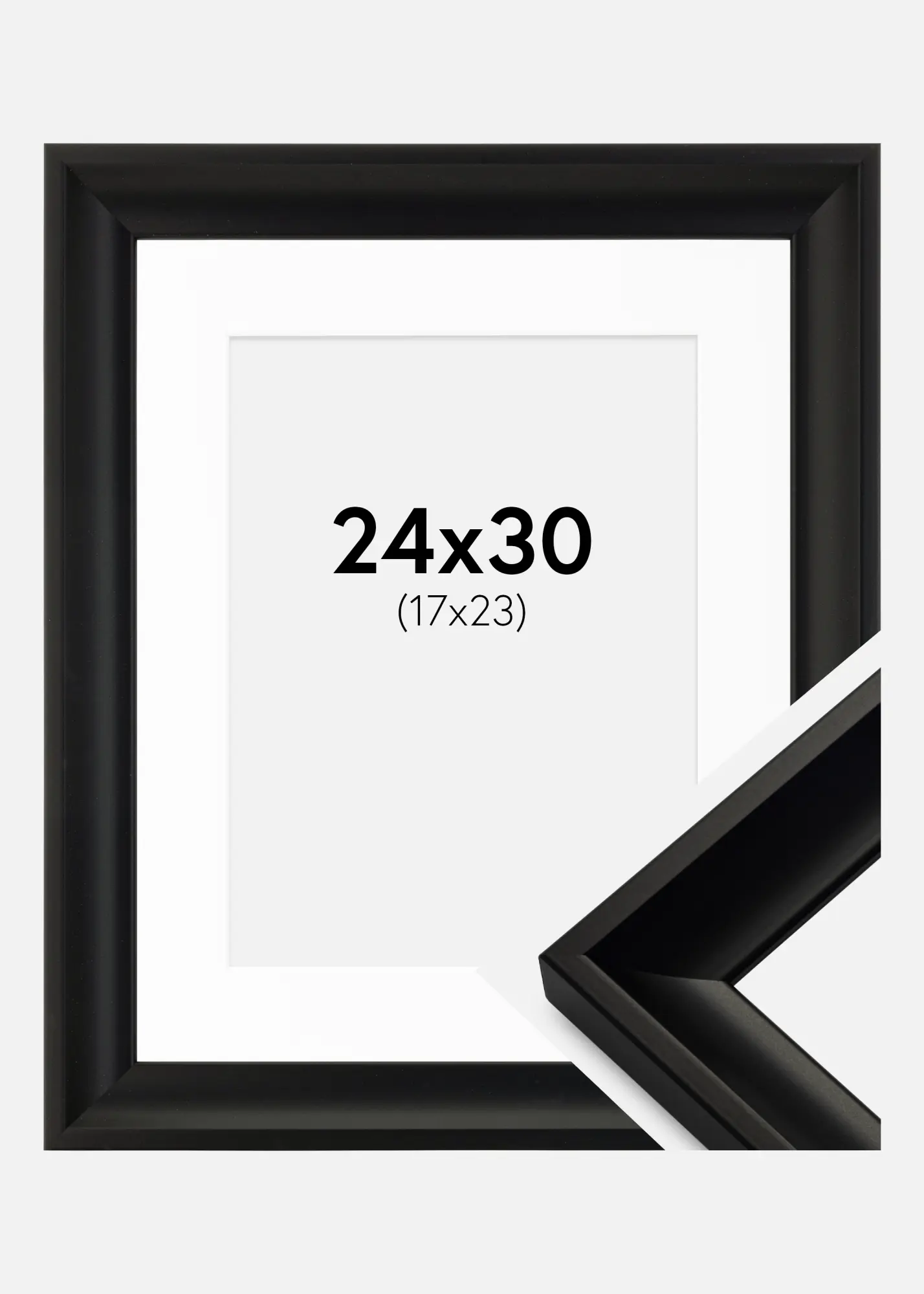 Package including picture frame and matching white mount. The product image shows the dimensions of the frame (indicated in bold) and the inner dimensions of the mount (indicated in brackets). Note that the inner dimensions of the mount should be 1 cm smaller than the image size.