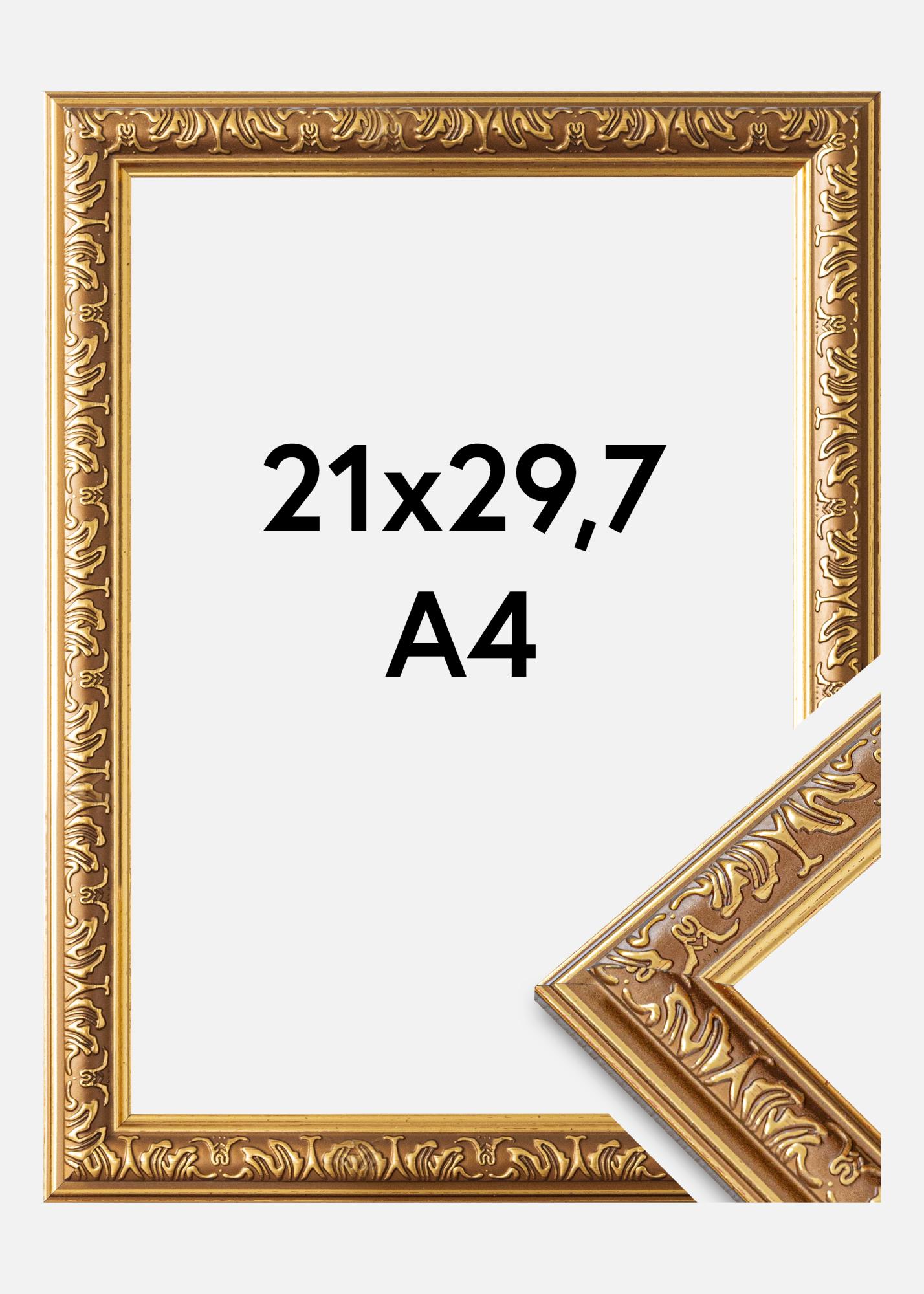 This photo frame in the size of 21x29.7 cm (A4) is a perfect combination of classic elegance and modern functionality. With its luxurious gold finish and decorative, ornamented details, it adds a sophisticated touch to any artwork or photographs. The intricate patterns along the inner edge of the frame create a traditional and timeless feel, making it ideal for both classic and elegant interior styles.