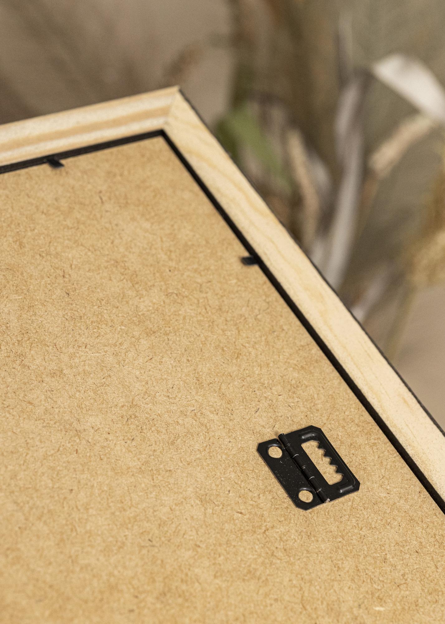 The solid wooden frame is fitted with acrylic glass which is both lightweight and unbreakable. On the back, you'll find the wall attachment that allows you to choose whether you want to mount the frame in portrait or landscape format. The back cover is held in place by flexible pins which allow you to remove the backing in order to mount your picture in the frame.