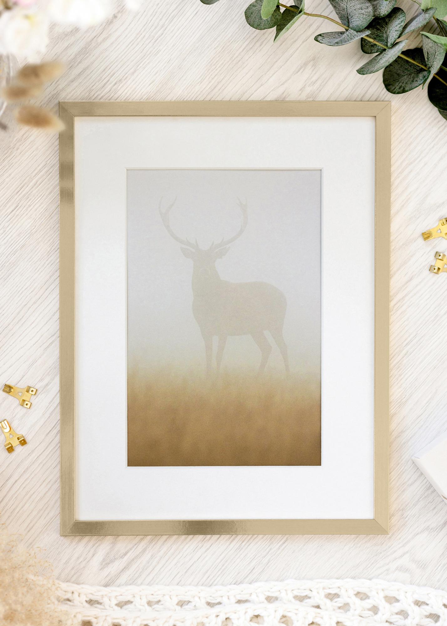 Create an elegant photo wall with our stylish gold frame, perfect for showcasing your favorite artworks or photographs. This picture frame in the size of 21x29,7 cm (A4) is a sophisticated detail that adds a luxurious touch to any room. With its shiny gold finish and glossy surface, it becomes an instant eye-catcher on your wall.