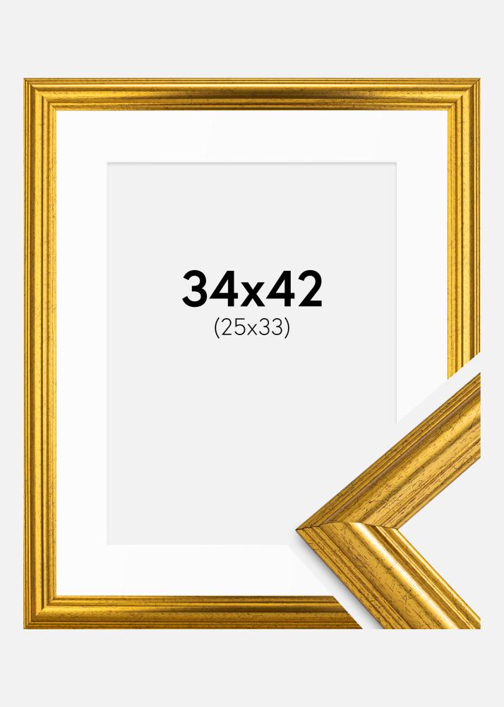 Transform your pictures into artworks with our elegant gold frame, complete with a white mat. This frame is designed to fit pictures sized 26x34 cm and provides a sophisticated framing that highlights the subject in a stylish manner.