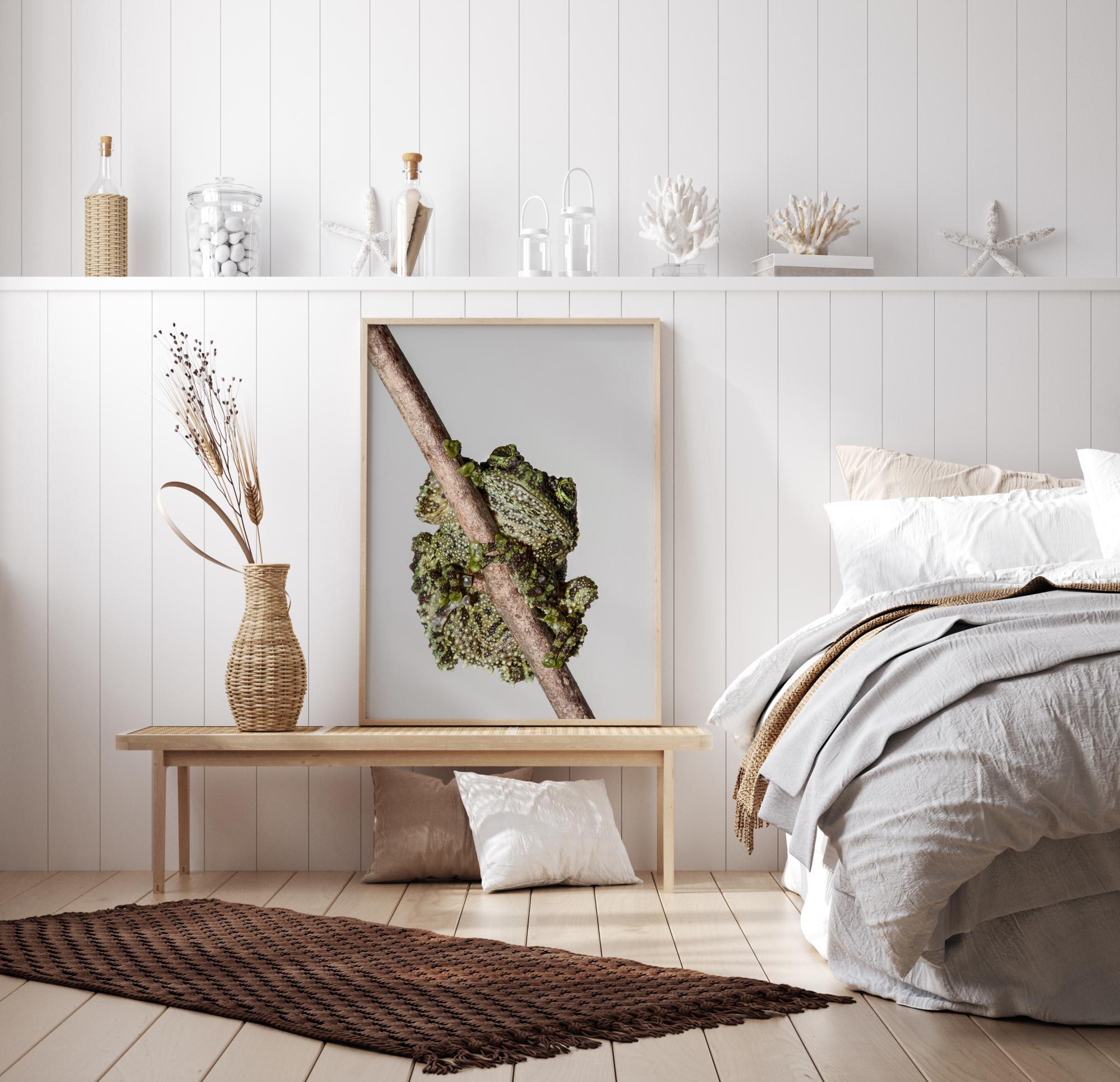 A macro poster of a frog on a tree against a pale blue sky. The details of all the frog's bumps, lumps, warts and all, can be seen as he clings to the thin branch. The eyes and mouth poke over the top in a cute and endearing image that would be at home on any wall.