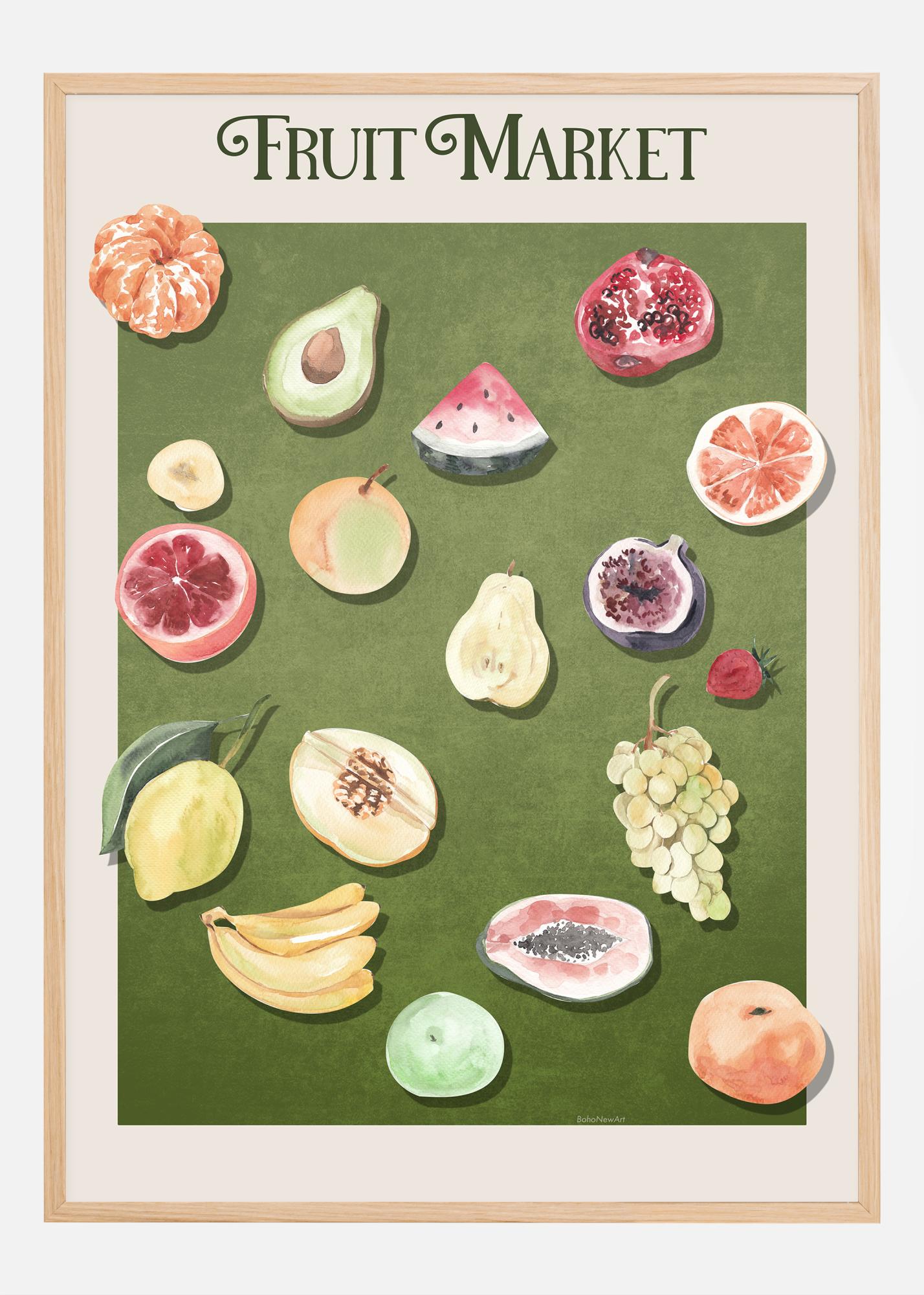 This colorful poster captures the essence of a lively fruit market and is a fantastic addition to our collection of interior art. The print is a visual delight with a range of juicy fruits presented against a rich green background, creating a sense of freshness and abundance. From the sun-ripened citrus fruits to the tropical features of avocado and pomegranate, this work offers a visual feast that both inspires and enhances. Each fruit is depicted with a richness of detail that highlights their unique textures and shapes, making this poster a must-have for anyone who appreciates lifelike art.