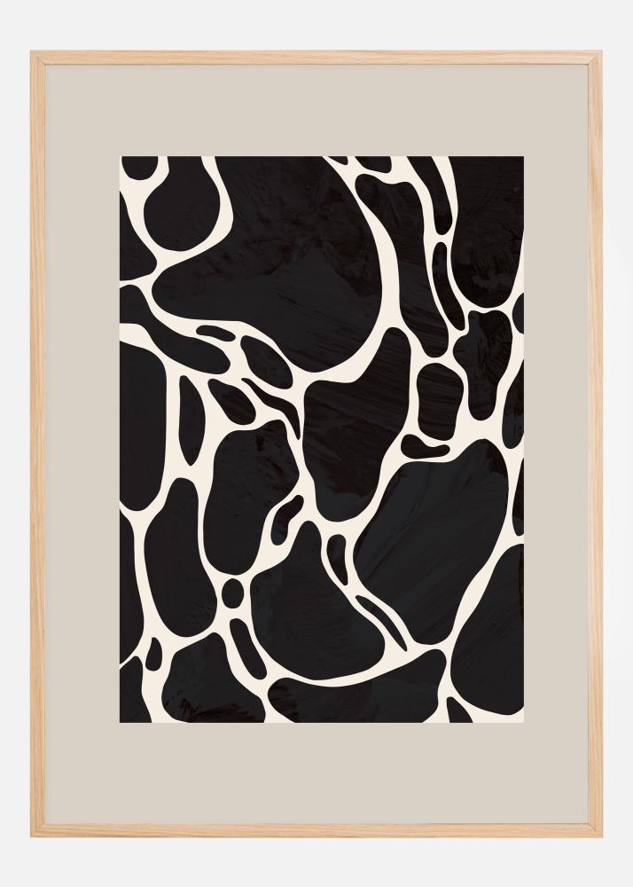 A graphical poster of giraffe spots in black and white. The large painterly blobs of black create a compelling image as, within them, there are paintbrush swirls to add texture. The thick white lines intersecting the giraffe spots create flow and movement in the piece.