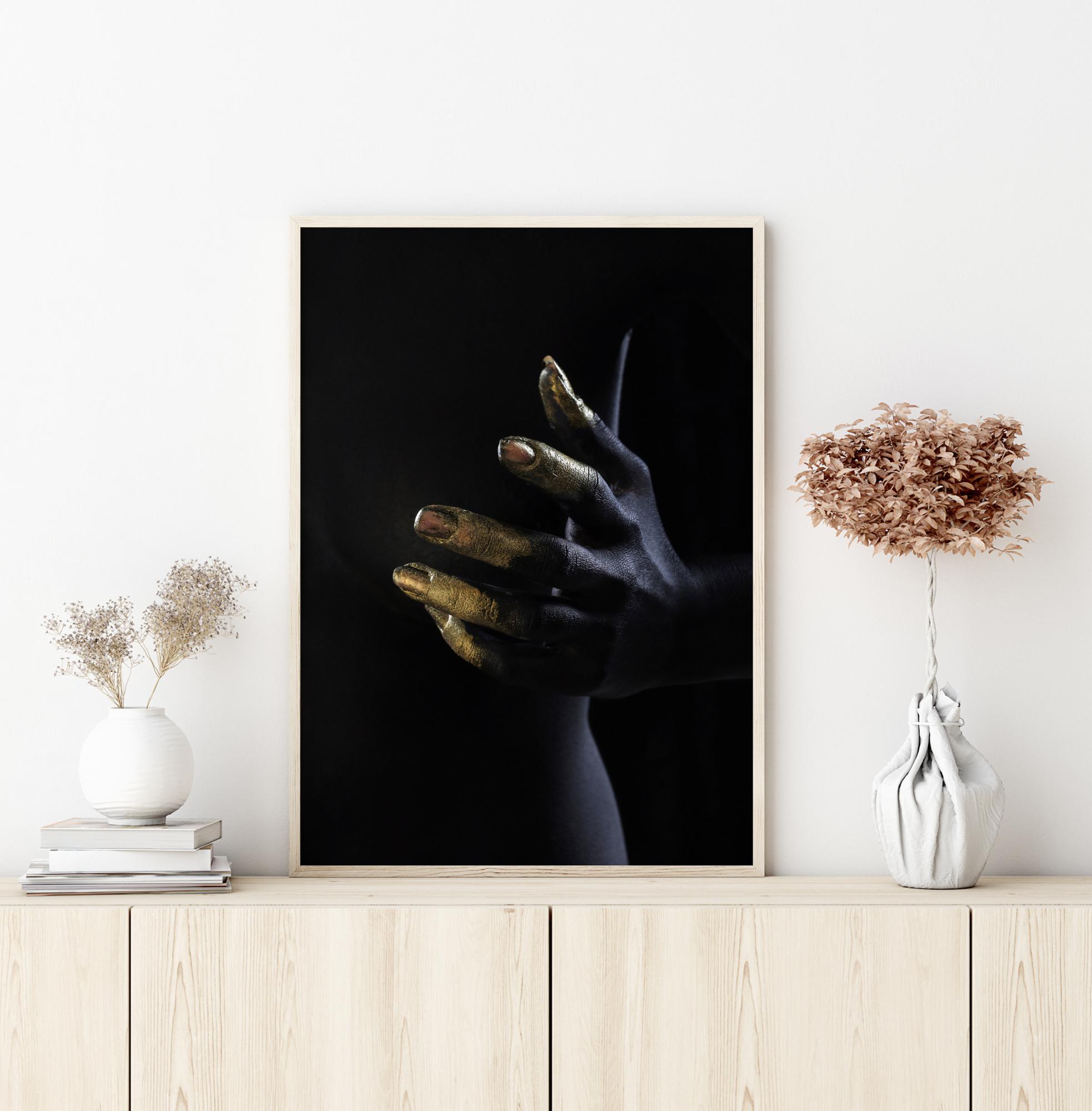 A contrasting poster full of drama as a hand reaches forward. Half the hand is black, while the fingers are painted gold as the hand reaches out. Part of a body can be seen, illuminated with light from the right to stand out against the black background. A truly artistic piece perfect for any neutral wall.