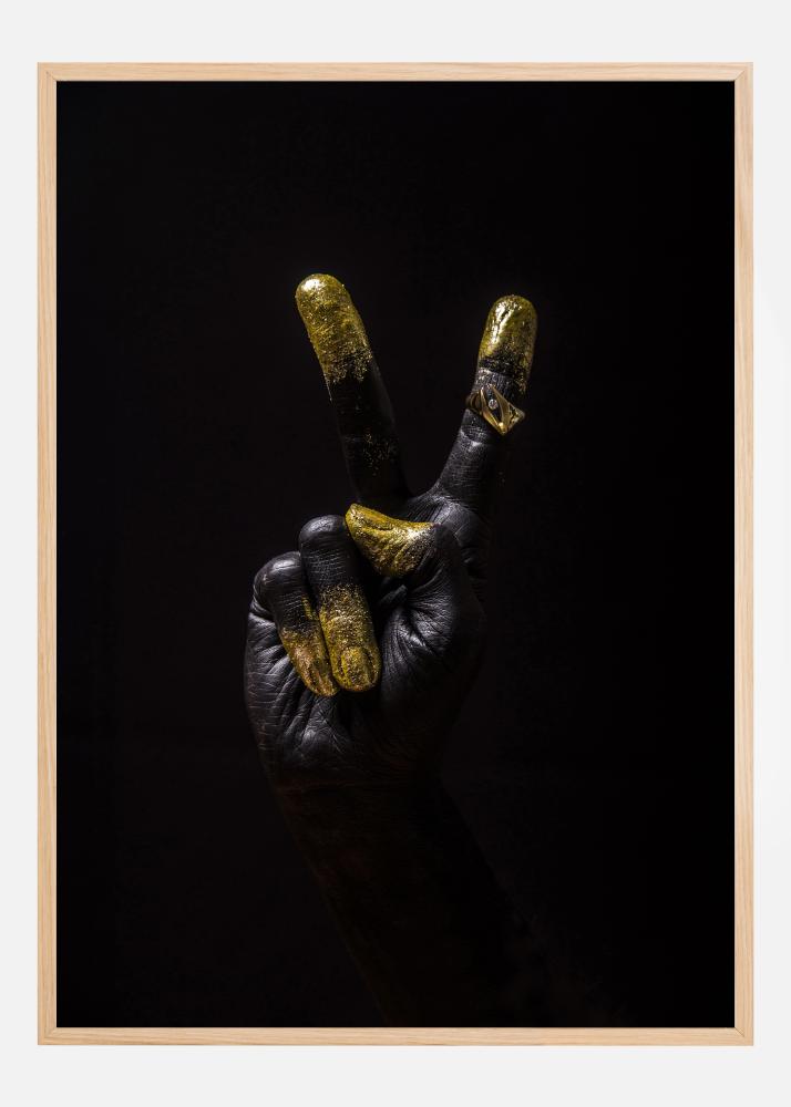 A peace-loving poster of a hand reaching up to do the peace sign. The black hand is almost hidden on the black background. However, all the fingers are painted gold so the V of the fingers clearly stands out. Keep that chill vibe when you add this to a wall at home.