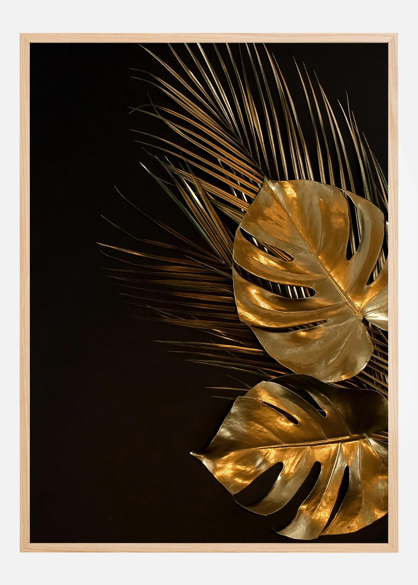 A natural poster of bright gold leaves against a black background. Golden cheese plant leaves and gold tipped fronds fill this stunning image. The sheen of the gold creates a glow that, despite the black background, lights up the room for an elegant, yet somehow festive feel.