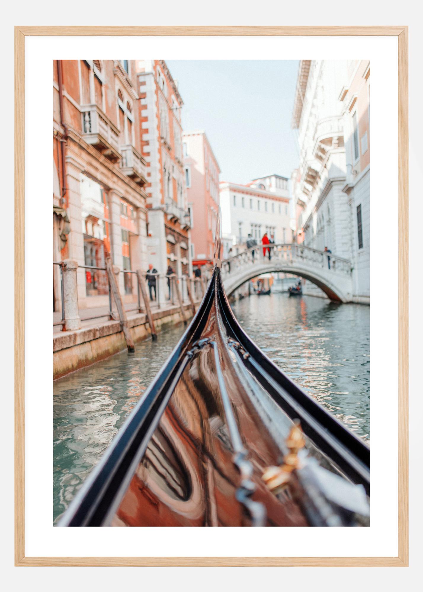 A classic poster of the prow of a gondola floating through the canals in Venice.The canal passes between soft pink and white houses, heading towards a white bridge where people watch. Imagine you're on holiday when you bring this home.