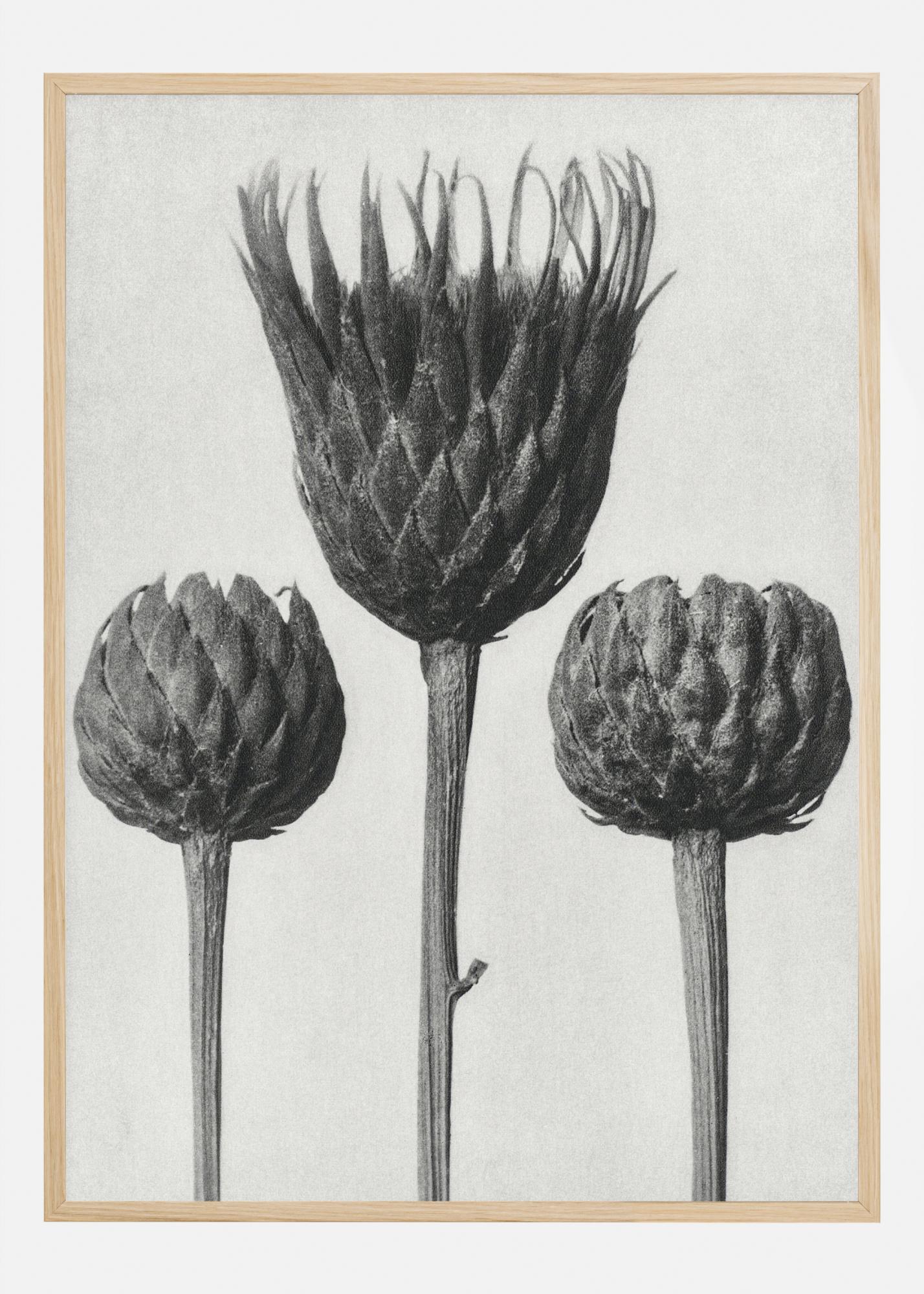 A nature poster featuring three single stemmed grey flowers. Standing tall on a white background, the three grey flowers are almost positioned side by side. The grey flower in the foreground has opened more than the small flowers. The ideal print to hang in your conservatory.