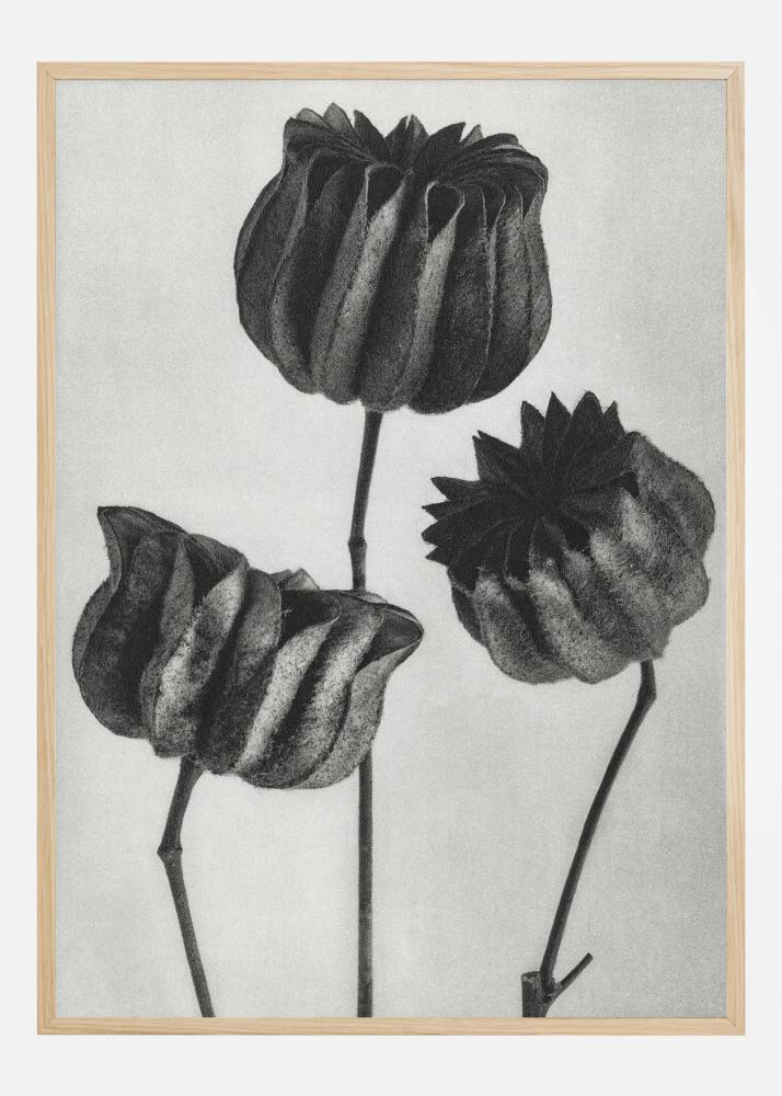 A wonderful black and white modern print of three flowers at different heights. The central flower has a straight stem while the other two are bent at the neck. Set on a white background, this simple yet delicate print is ideal to hang on a bright wall in a living room.