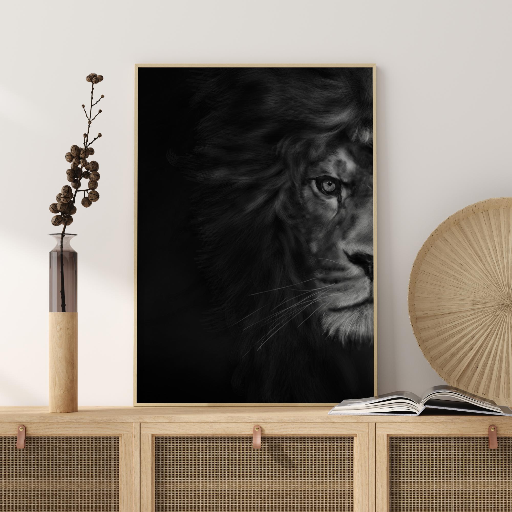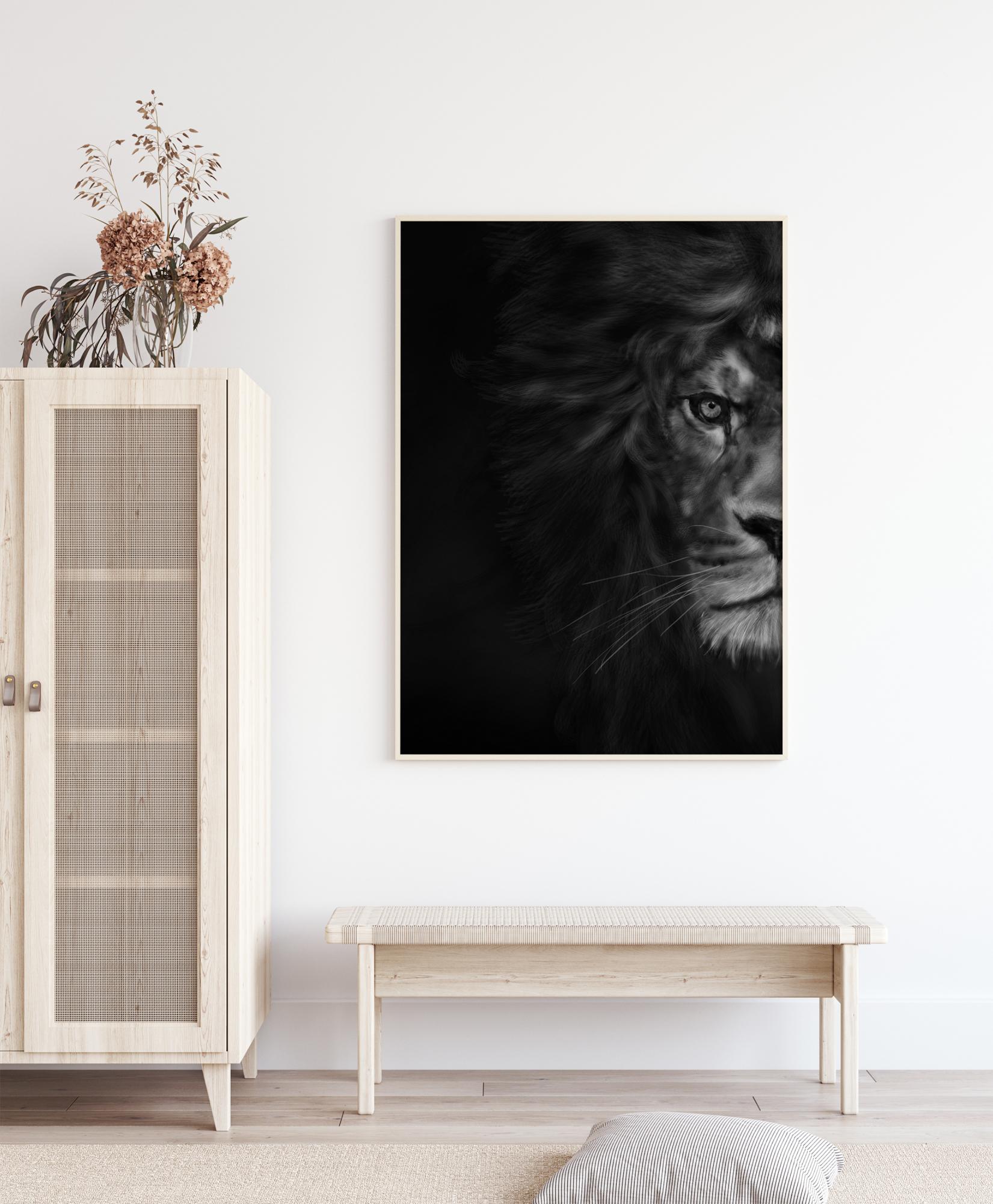 An imposing black and white wildlife print of a ferocious lion staring directly into the camera. Positioned to the right of the print, only half the lion's face is visible. With its beautiful wavy mane and majestic pose, he can certainly be defined as the king of the jungle. Bring the safari feeling to your home.