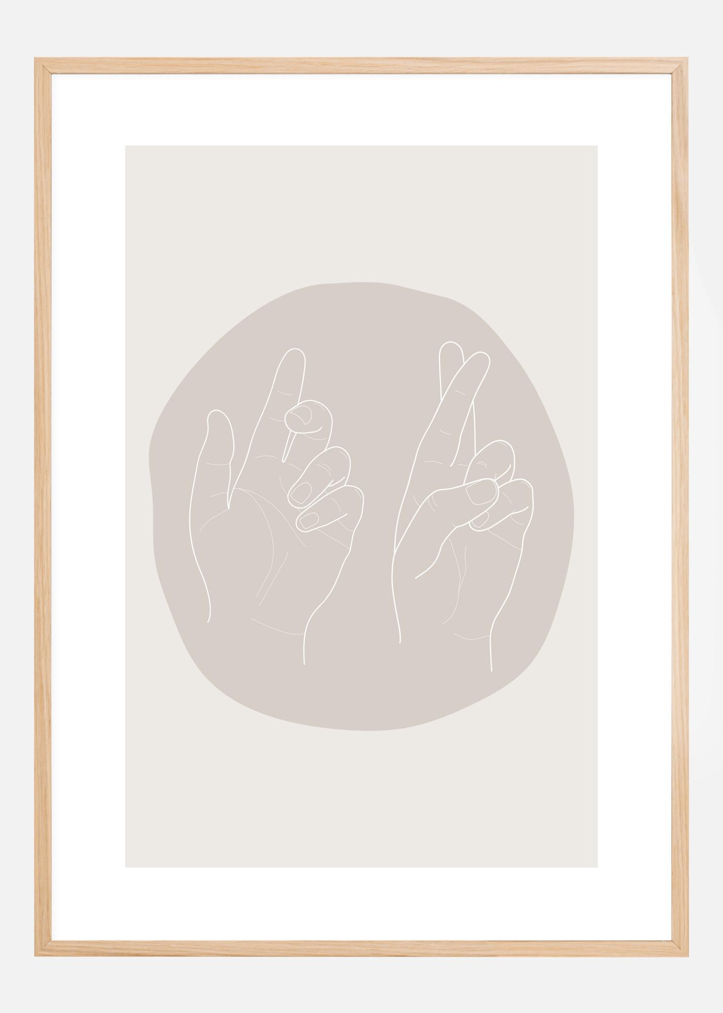 A simple print of two left hands on a circular beige shape. The circle has be mounted on a nude colour background with both hands pointing towards the top of the print. The hands are relaxed, creating a tranquil ambiance for your home. The perfect print for your work study.