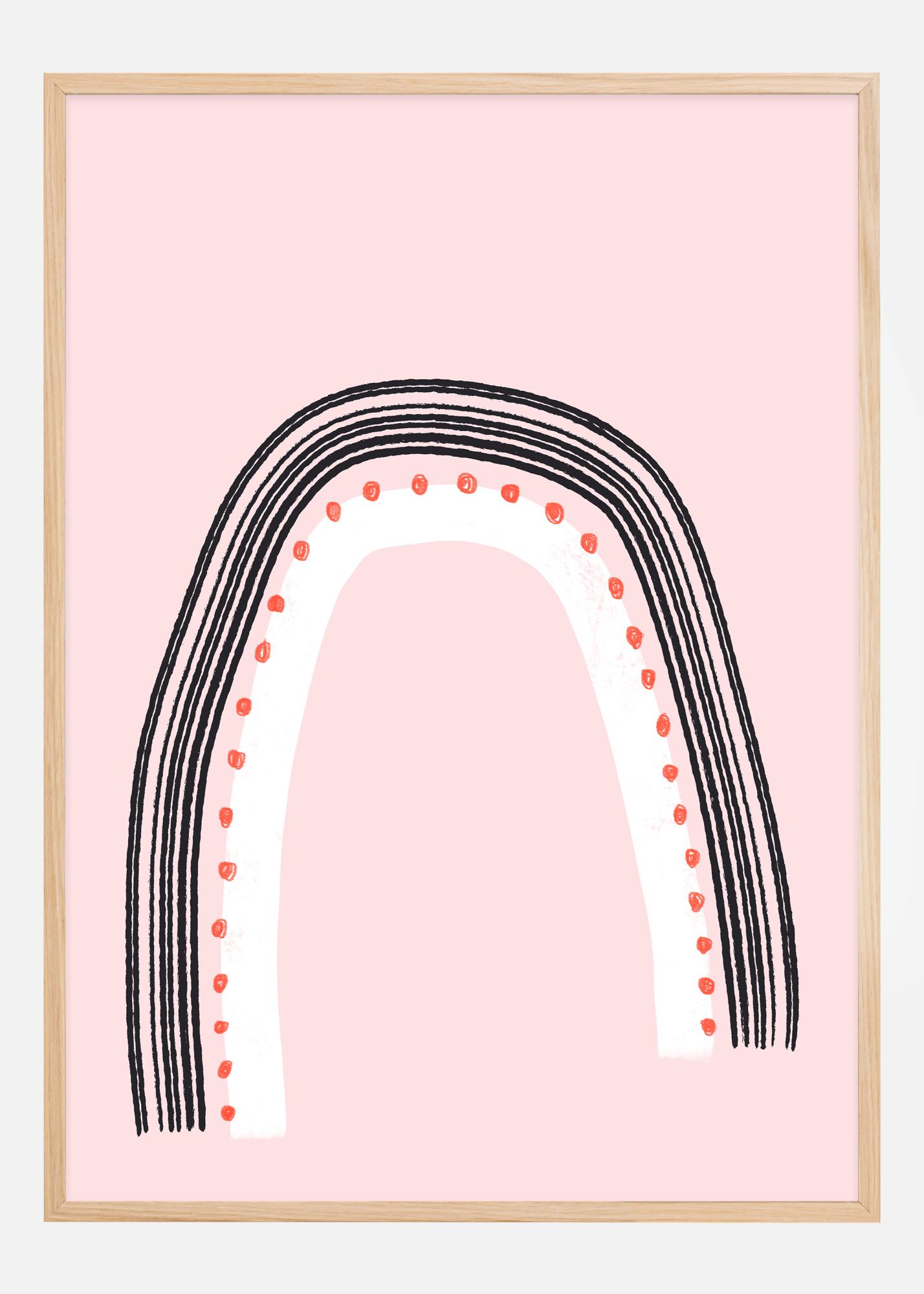 This playful and charming poster depicts a stylized rainbow with a modern and graphic approach. Against a light pink background, the bold, black outlines of the rainbow's arches create a clear contrast, while rows of small red hearts follow one of the curves, adding an irresistible sense of joy and positivity. This print exudes simplicity and joy and could brighten up any room with its charm and friendly aura.