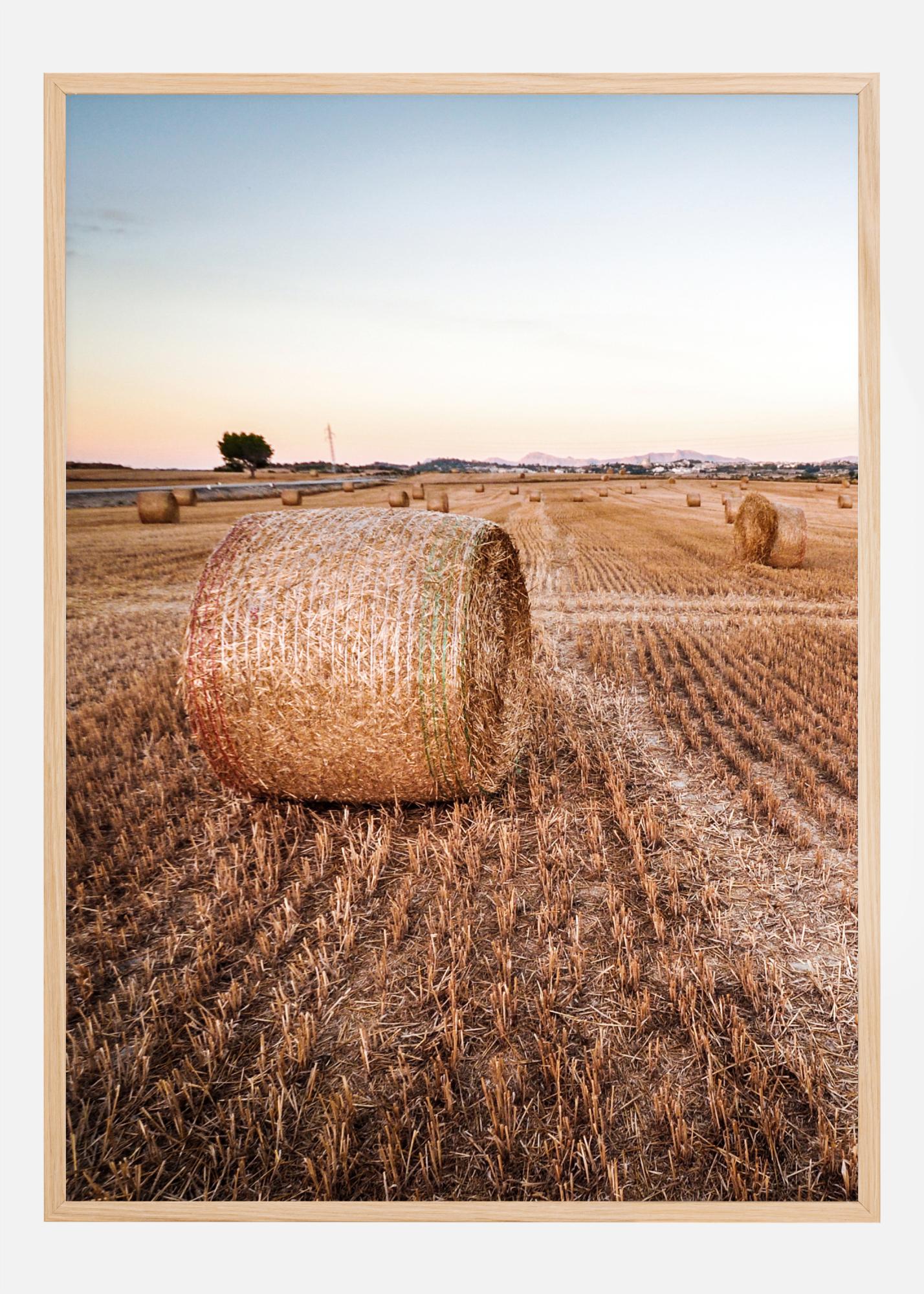 A simple but beautiful nature image. The haystack in the foreground has been rolled neatly ready for harvest, while in the distance there are other rolled haystacks scattered around the fields. A pale blue sky and the warm brown colours create a warm relaxing image to hang in a country kitchen.