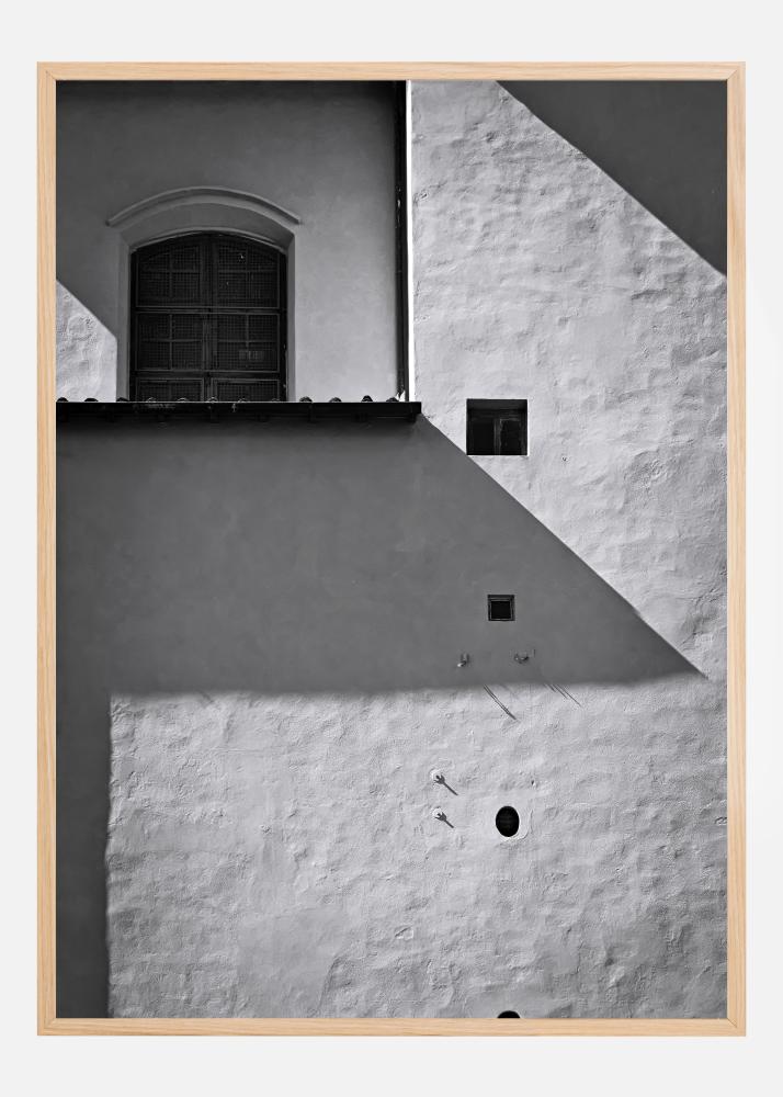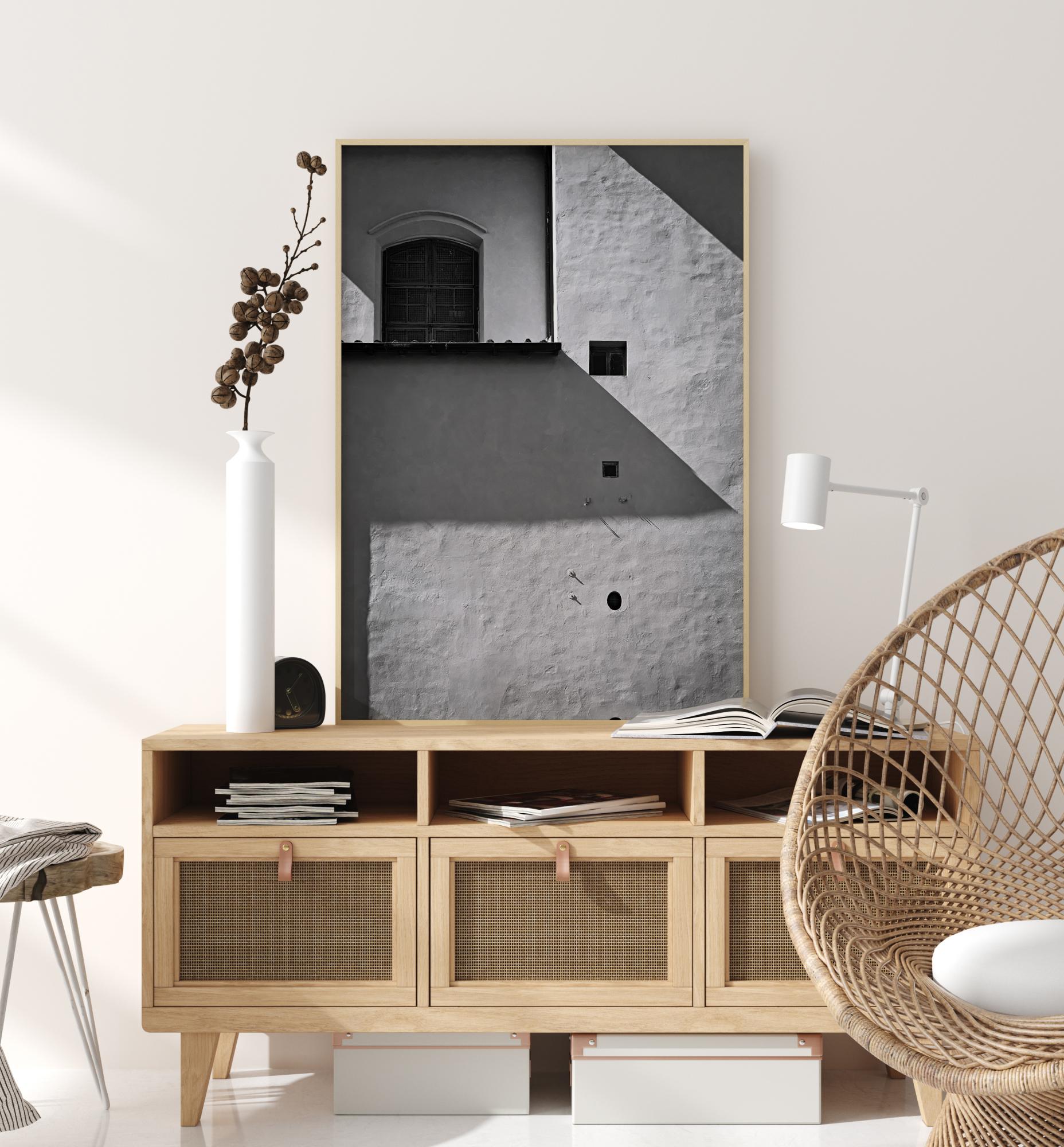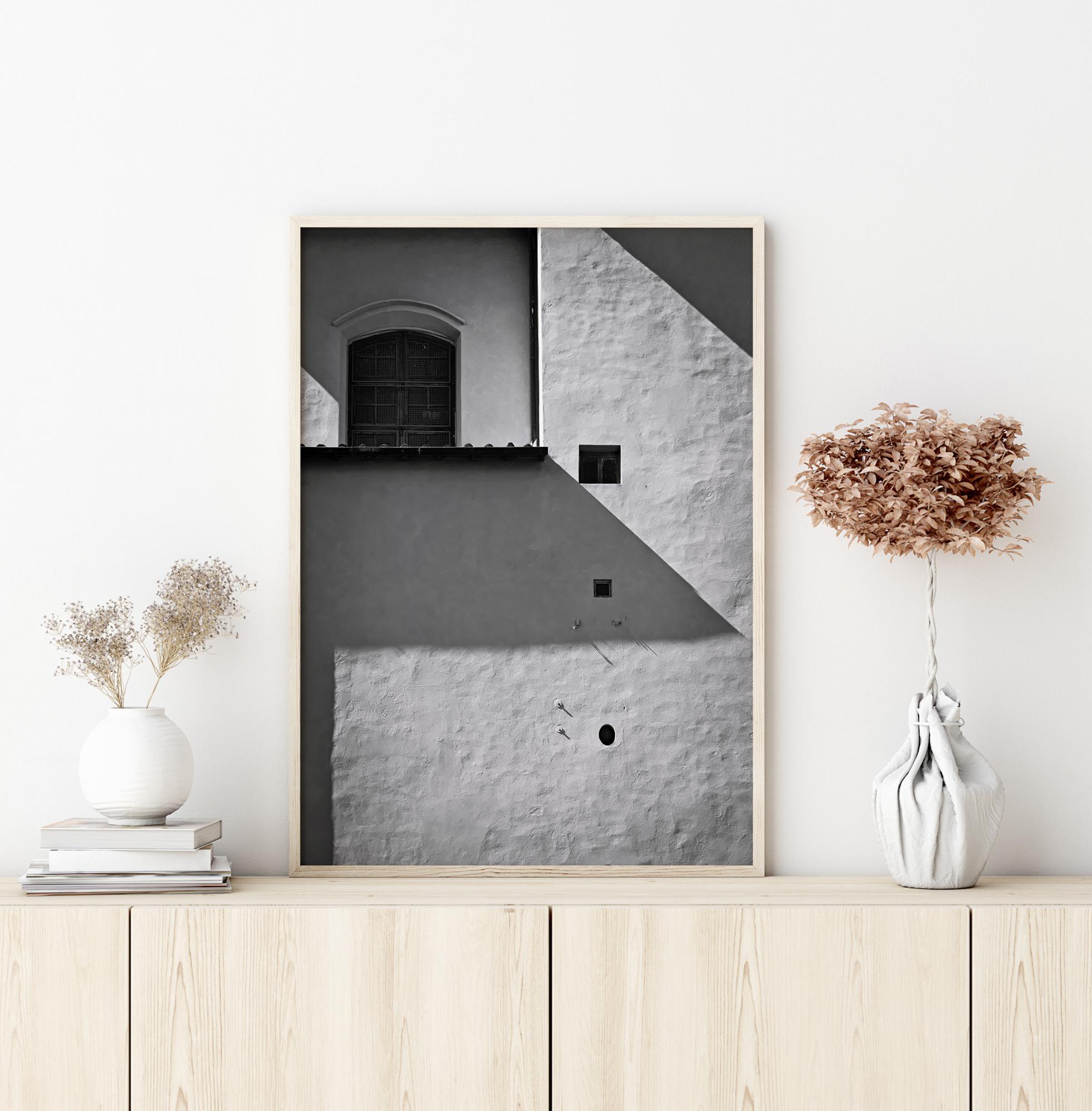 A simple yet beautiful black and white print with a brown wooden door in the centre of the image. The natural sunlight casts a shadow on the wall. Four small brown holes are positioned one under another to the right of the picture. Use your imagination to find out what is behind that huge wooden door.