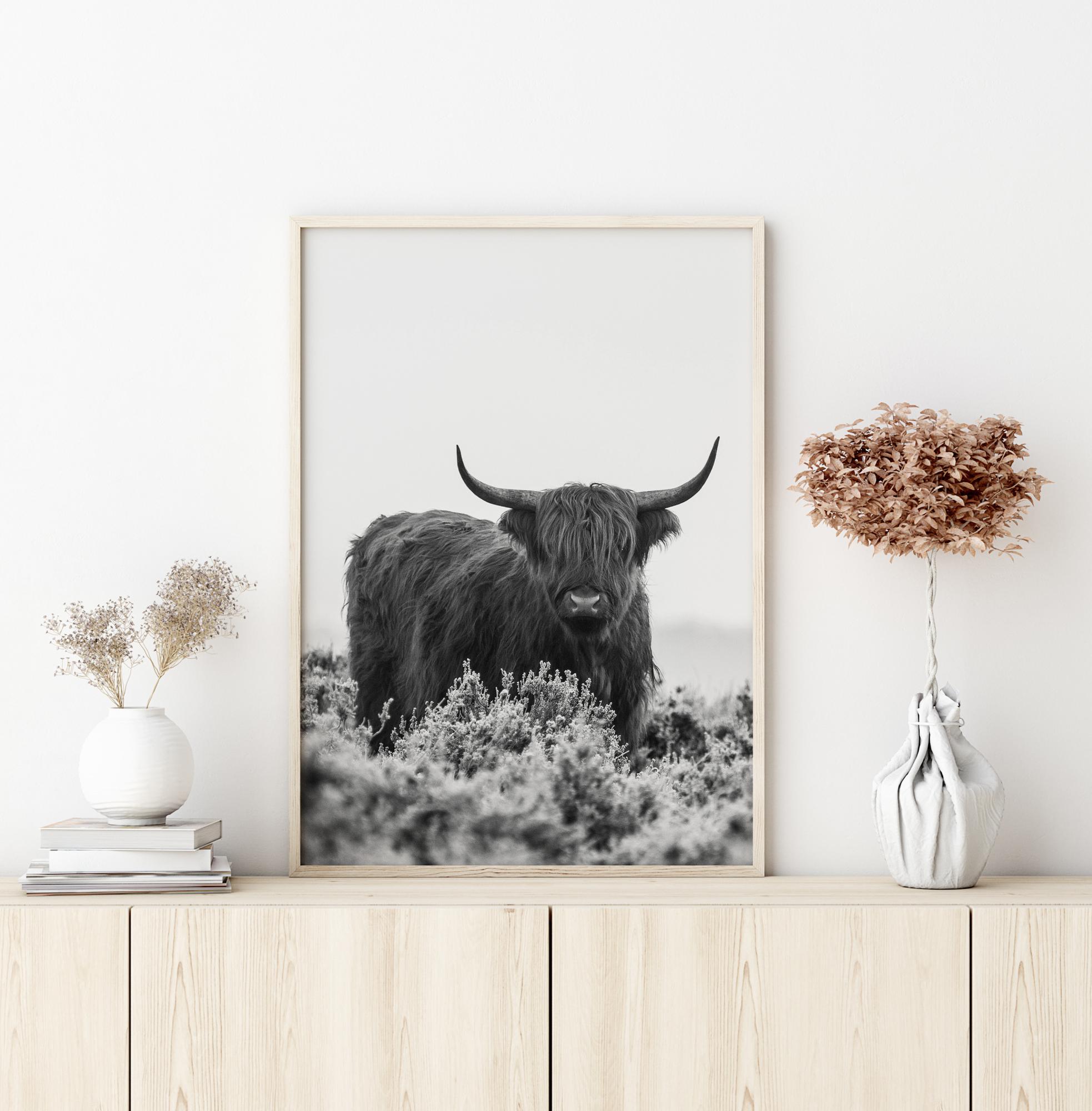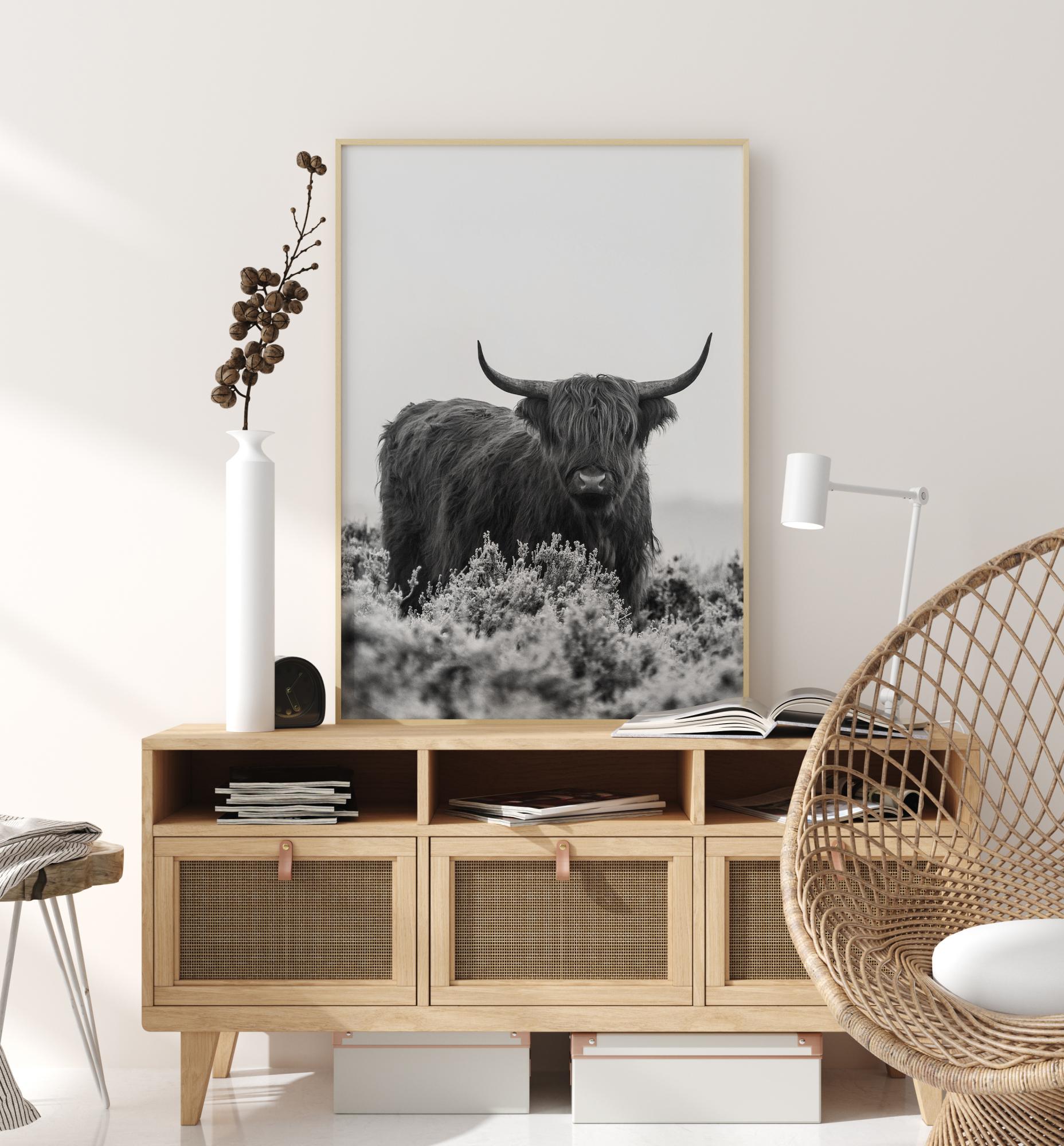 A beautiful wildlife print portraying a lonely cow on the moors. Surrounded by high grass, this magnificent animal stares straight into the camera. Standing against a grey sky and high grass, you can almost feel the cold wind on your face. The perfect print for any animal lover.