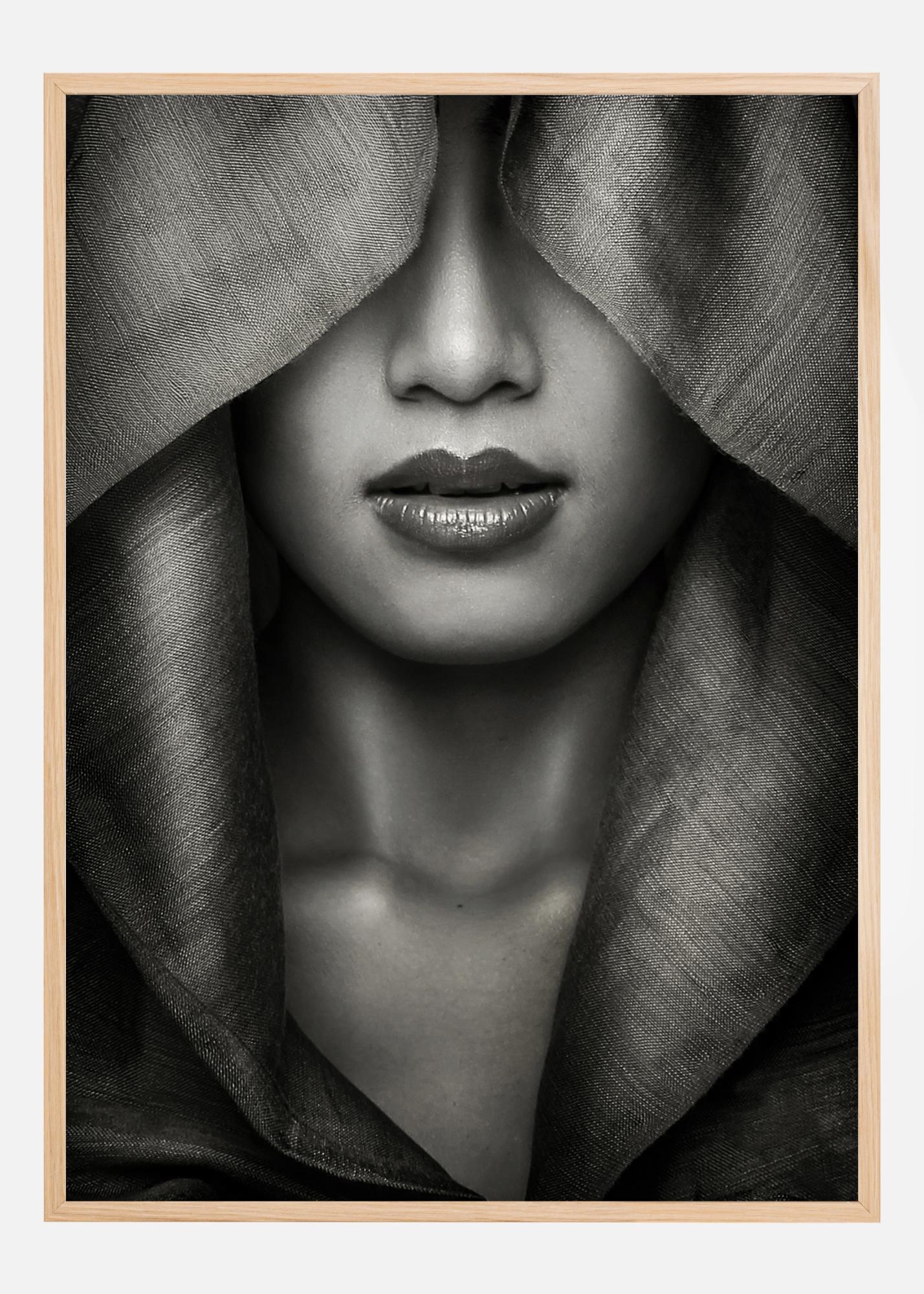 The image depicts a powerful and captivating close-up of a person draped in fabric, focusing on the pronounced lips and strong jawline. The detailed texturing of the fabric and the soft shadows on the skin add depth and complexity that draws the viewer into the subject. The monochrome palette highlights every detail and creates a timeless feeling.