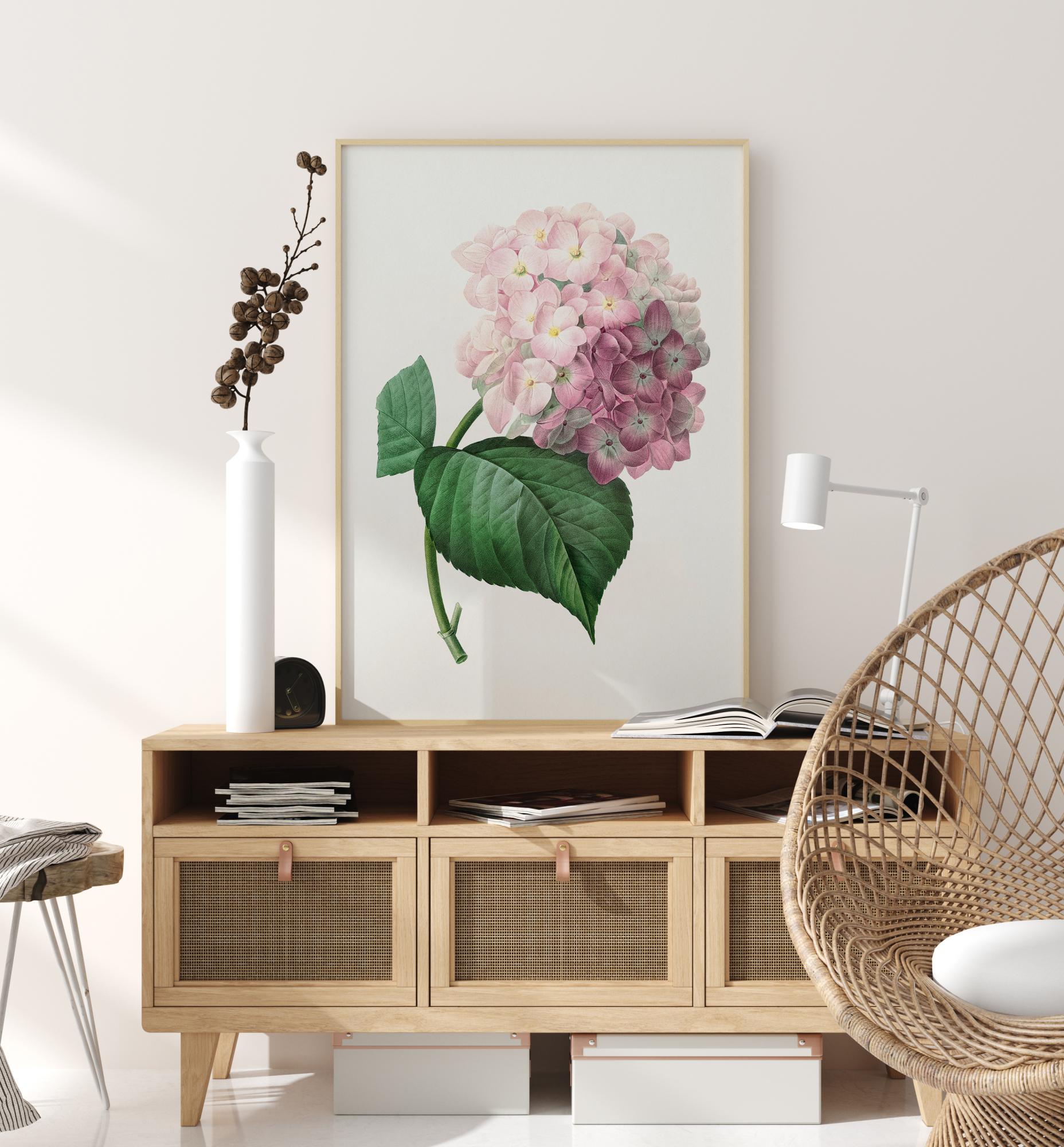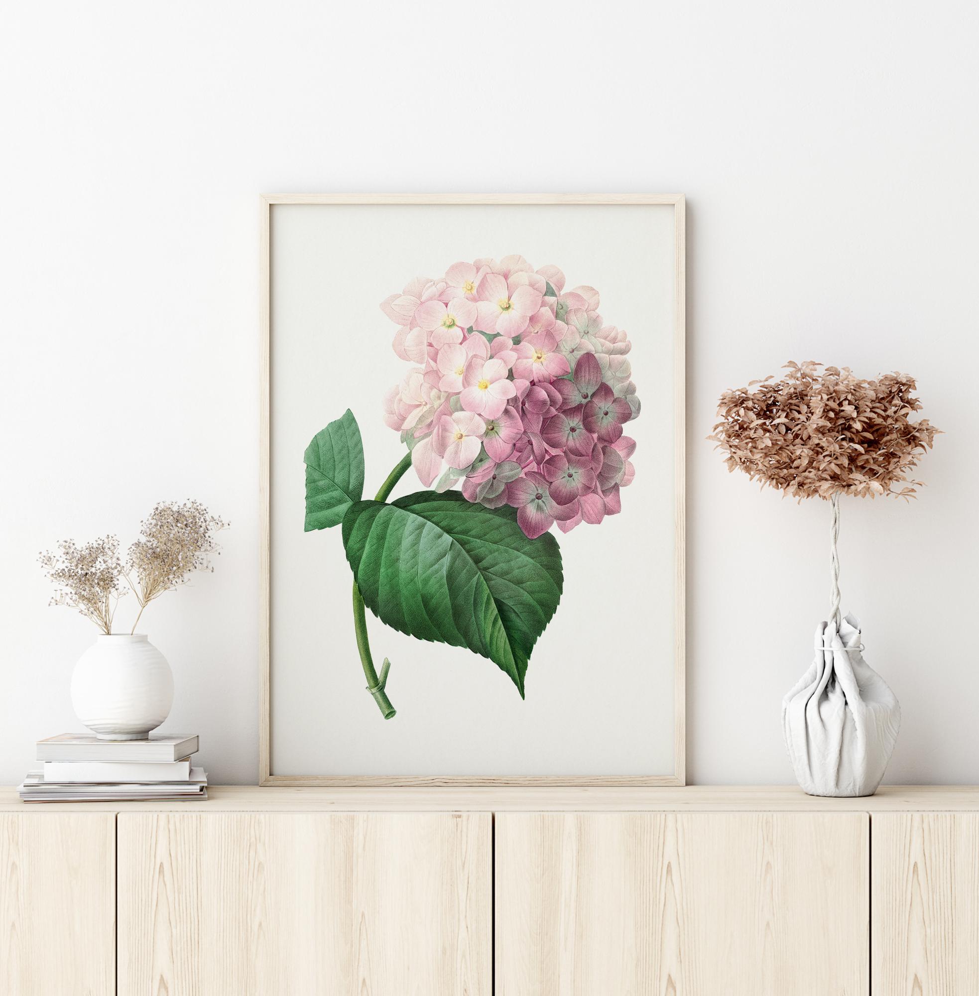 A floral print of a Hydrangea. Soft pink petals with a smooth green stem and a green leaf dominate the centre of the picture. On a crisp white background, this beautiful but delicate flower envokes a feeling of tranquility. Hung in your conservatory, this will add a touch of class to the environment.