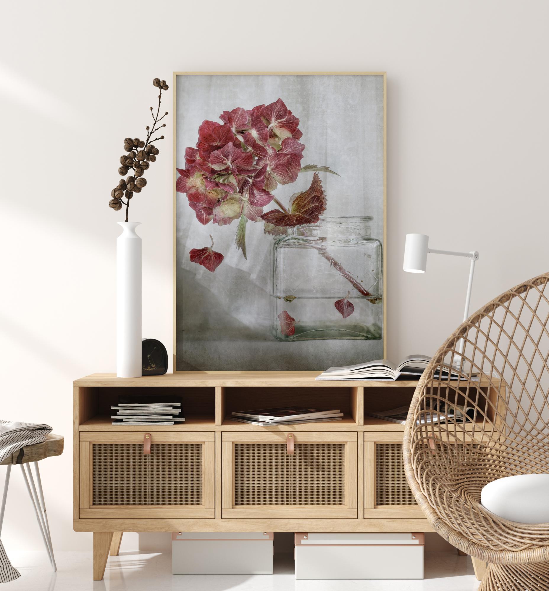 A beautiful nature print of a single stemmed Hydrangea in a transparent vase. Positioned in front of a flowery white curtain, a delicate pink petal is falling. Both a gentle wind and the curtain are blowing. Feel the cool breeze in this picture.