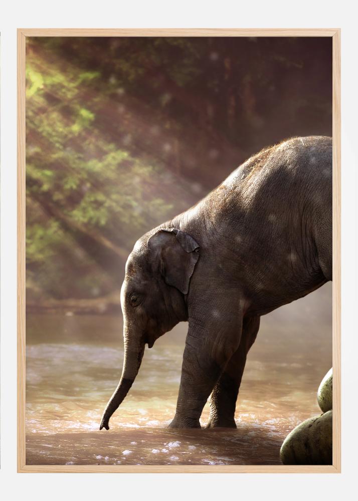 A sweet photo of a baby elephant being encouraged to enter the river by its mother. The daylight shines through the trees and reflects on the water, creating a sense of warmth.Hesitant to enter the water, the mother gently pushes her baby off the rocks. A sweet print to reflect the intense love between and mother and baby.