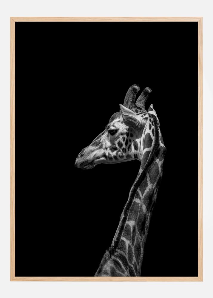 This bold and expressive poster presents a majestic giraffe against a pitch-black background, creating a dramatic contrast that captivates the viewer's gaze. The giraffe's unique grayscale pattern is skillfully captured, with each spot and line highlighted in detail. The richness of detail in the giraffe's skin texture and the soft shades of gray against the black background give an almost three-dimensional effect.