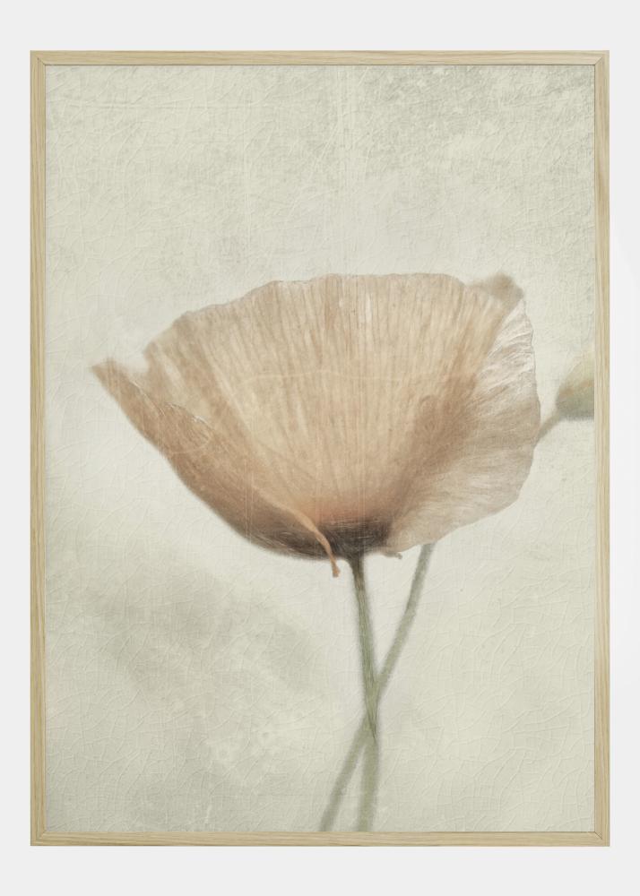 A beautiful nature portrait of a single peach coloured poppy on a beige background. With its soft coloured petals widely open, it portrays a feeling of peace and tranquillity. The transparency of the petals show the black heart of the flower. A meaningful print to hang on a pale coloured wall.