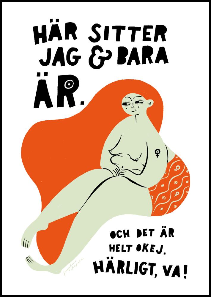 A fun modernist poster of a naked woman with flowing orange hair sitting on a patterned orange couch. This contemplative piece offers a simple life-affirming phrase in Swedish to add some meaning to the piece. Enjoy this simple line drawing print when you wake up every morning.