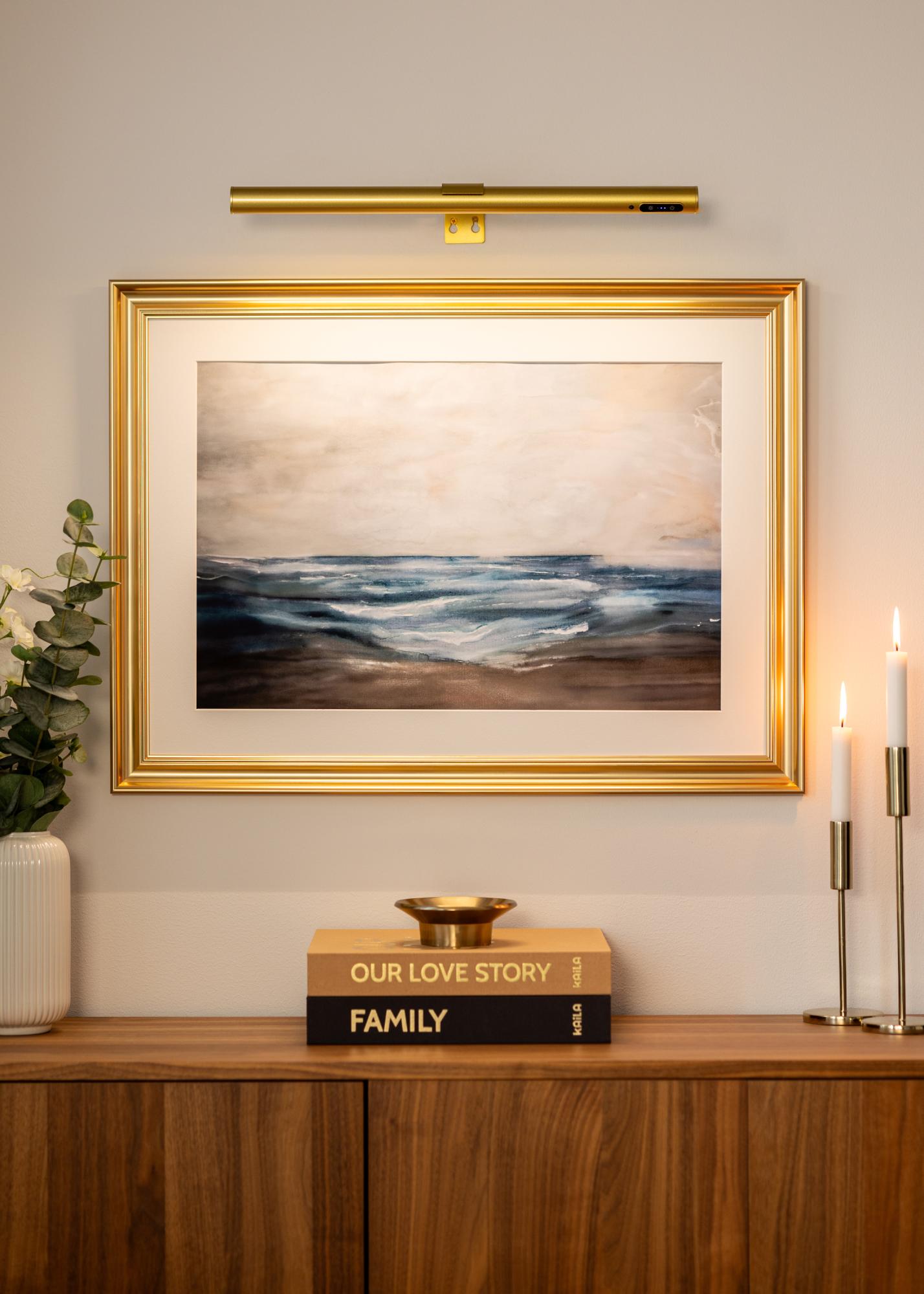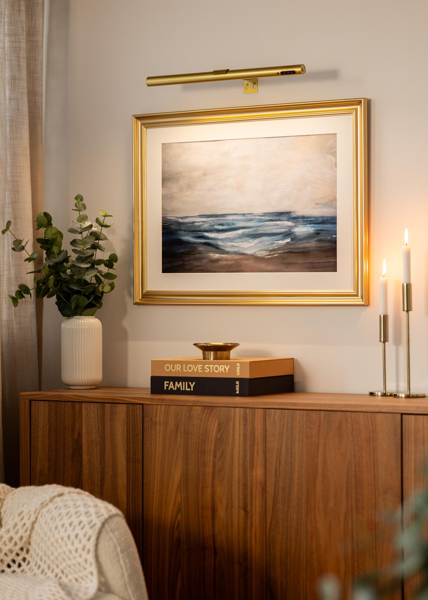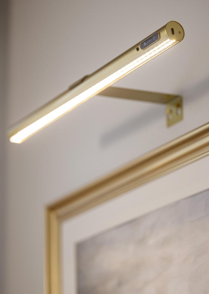KAILA Halo is a stylish and battery-powered photo lighting in gold, perfect for illuminating your artwork without disturbing wires. Thanks to the wireless design, you can place it anywhere without having to consider electrical outlets. The elegant gold finish gives an exclusive expression, while the light spreads evenly to highlight details and colors beautifully. Easy to mount and convenient to use – a practical solution to give your paintings the attention they deserve.
