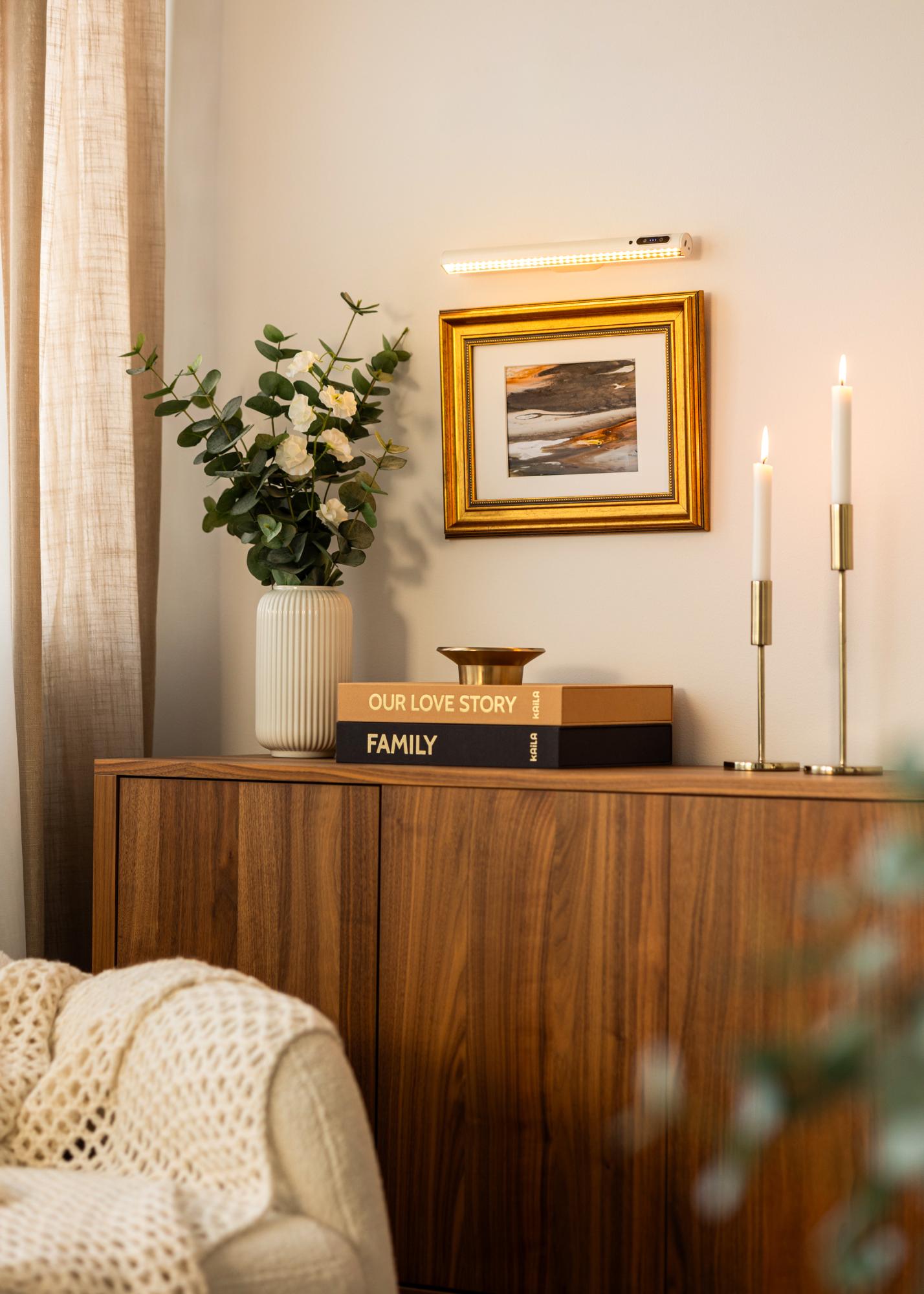 KAILA Illuminate is a stylish and battery-powered photo lighting in a white finish, perfect for highlighting your pictures without distracting cords. The cordless design makes installation easy and flexible, without needing to think about power outlets. The elegant white color provides a modern and discreet expression that blends into different interior styles, while the even light highlights details and colors in your art. Easy to install and use – a practical and convenient solution for your wall art.