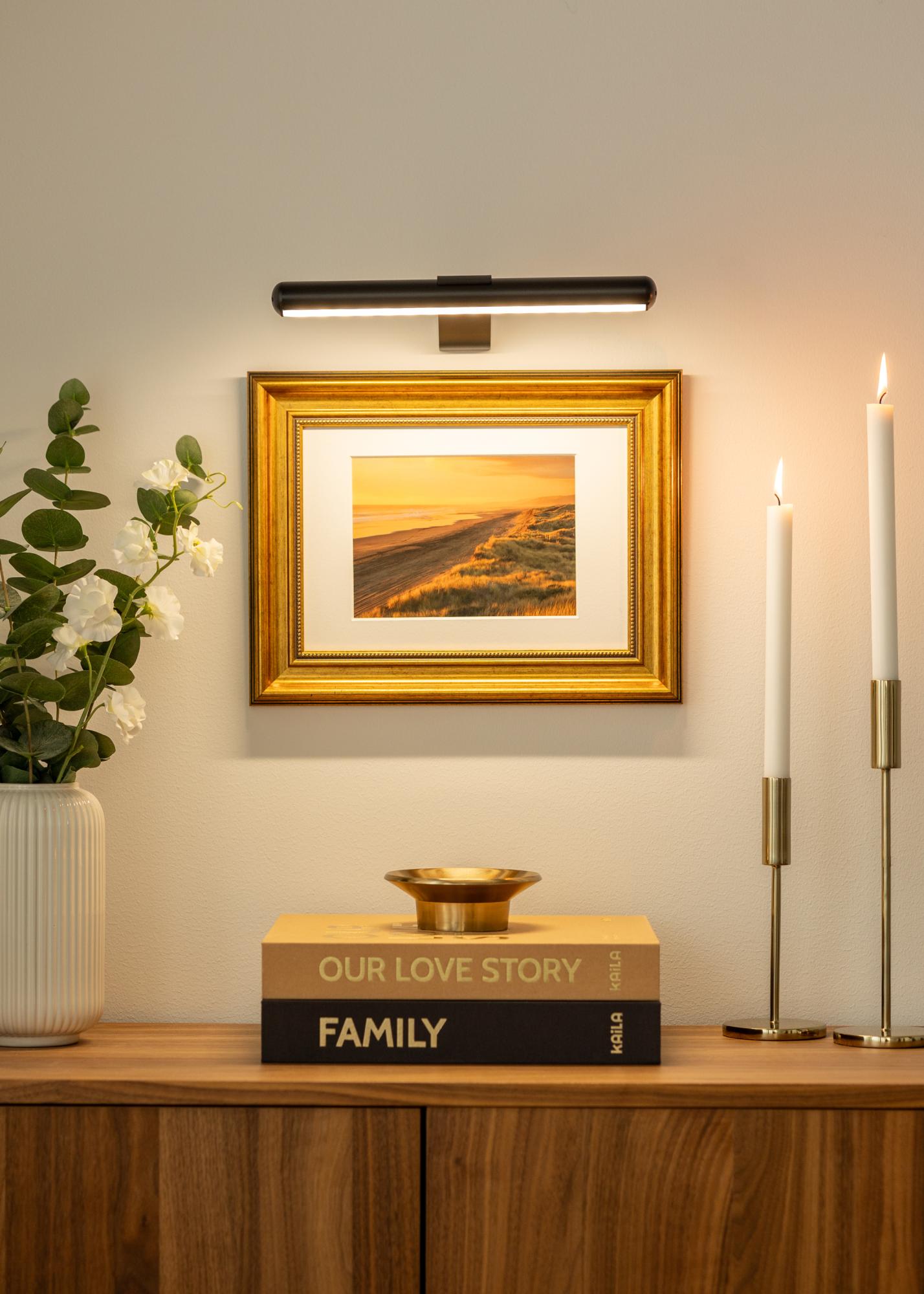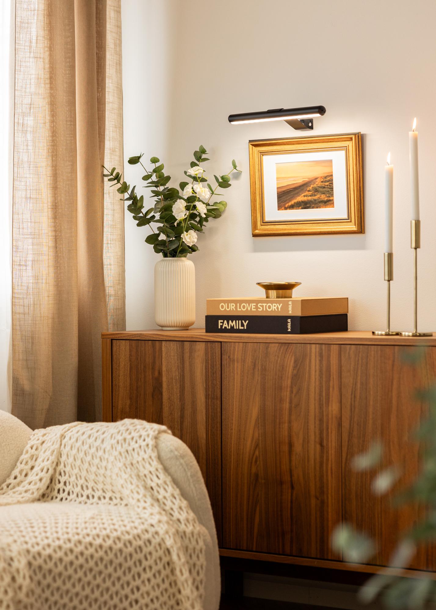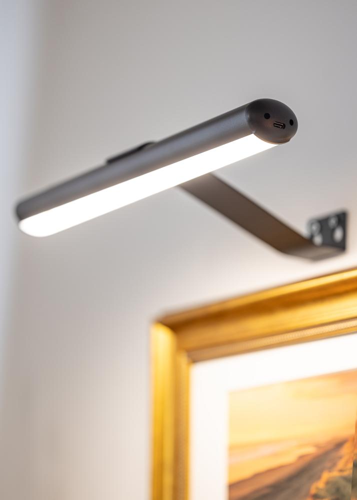 This battery-powered picture lighting in black design is a stylish and practical solution for highlighting your artwork without needing to use cords. With a flexible installation, it can be placed anywhere on the wall, making it perfect for spaces where there is no power outlet nearby. With its compact depth of 15 cm and a length of 33 cm, it is excellent for illuminating artwork with a maximum width of up to 60 cm.