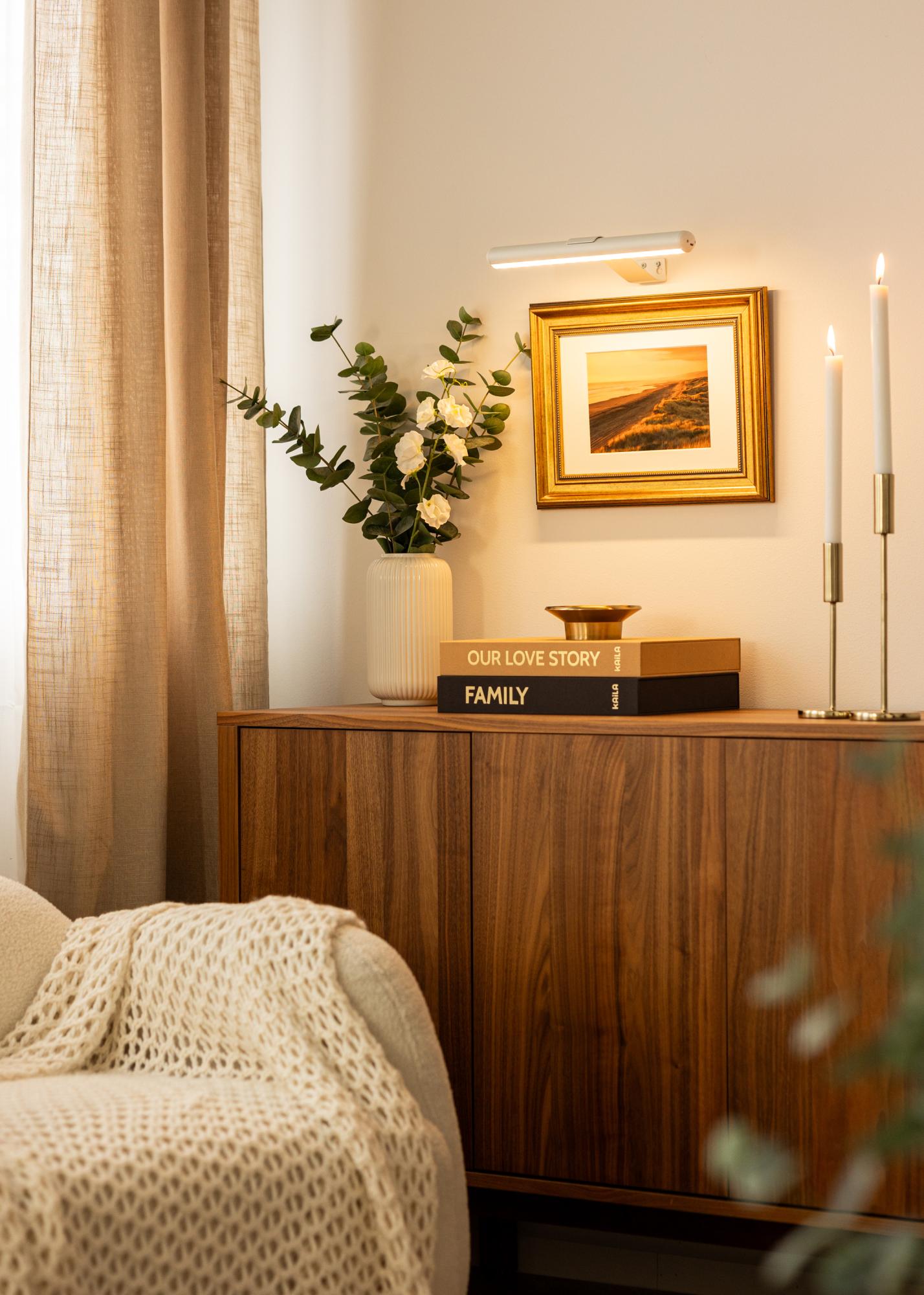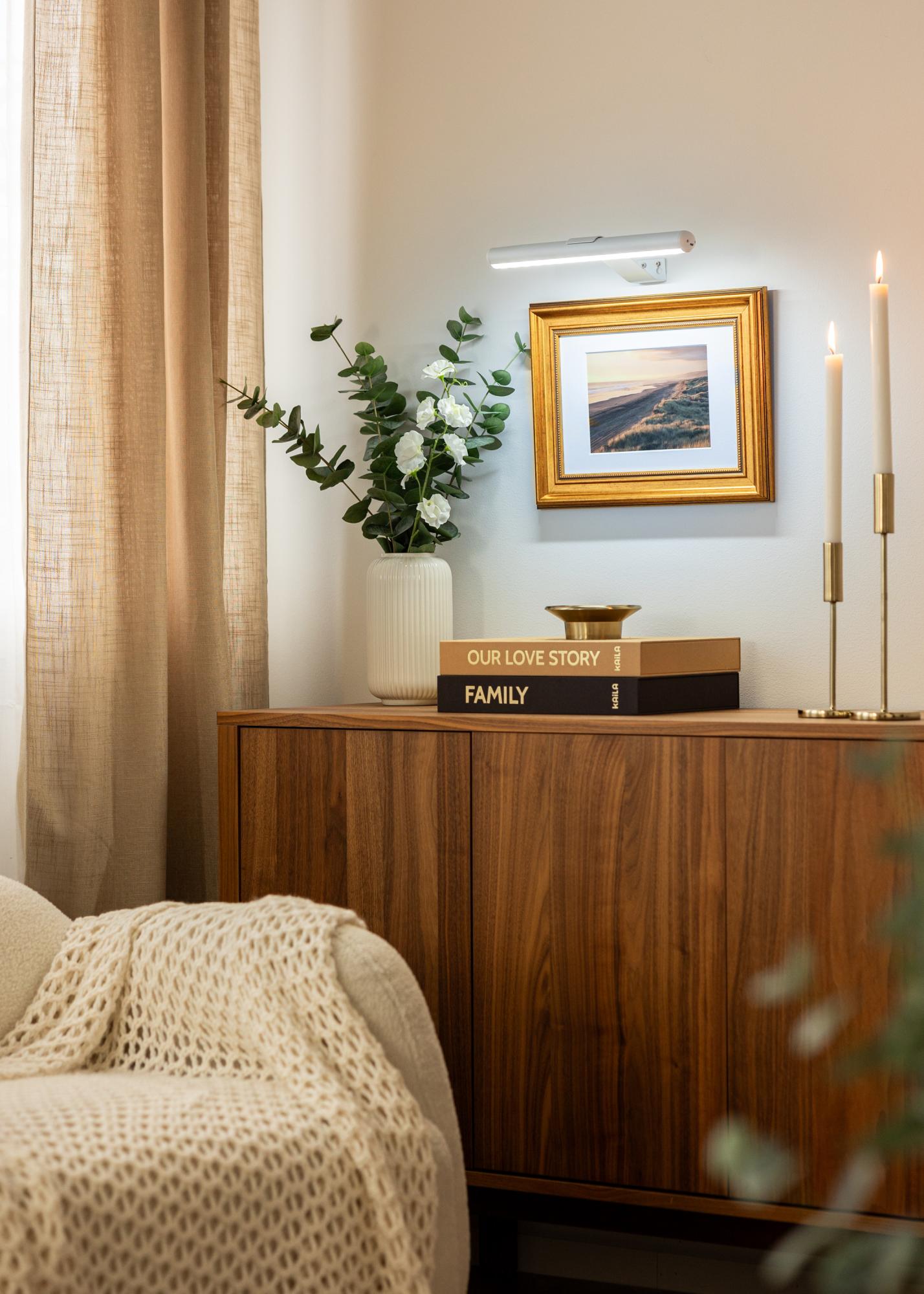 This battery-powered picture lighting in a white design offers a convenient solution to illuminate your artworks without having to run any cords. Since it is battery-operated, it can be placed anywhere without needing to think about power outlets, making it very flexible. With a depth of 15 cm and a length of 33 cm, the lighting is compact and easy to install, while being able to illuminate artworks with a width of up to 60 cm.