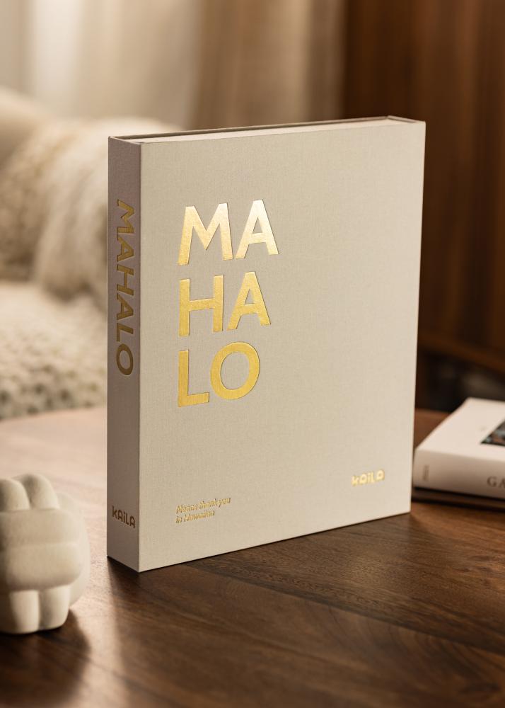 With this Coffee Table Book, you get a practical photo album and a home decor detail all in one! The album has an exclusive box design with a grey fabric cover and a gold-coloured lettering that reads "MAHALO". Printed in the left corner of the album you’ll find the descriptive subtitle "Means thank you in Hawaiian". The classic appearance allows this Coffee Table Album to fit perfectly on the bookshelf or on the living room table.
