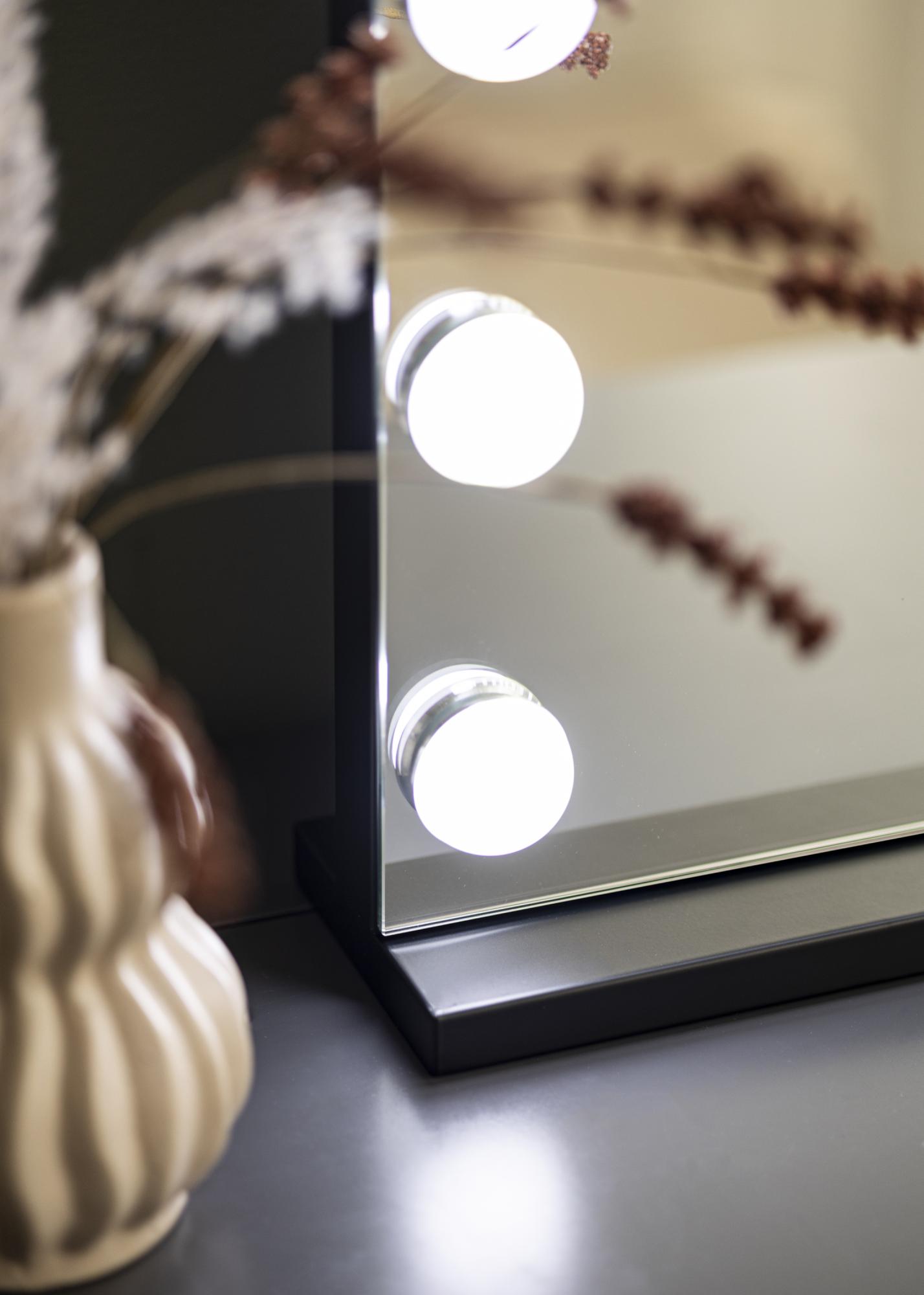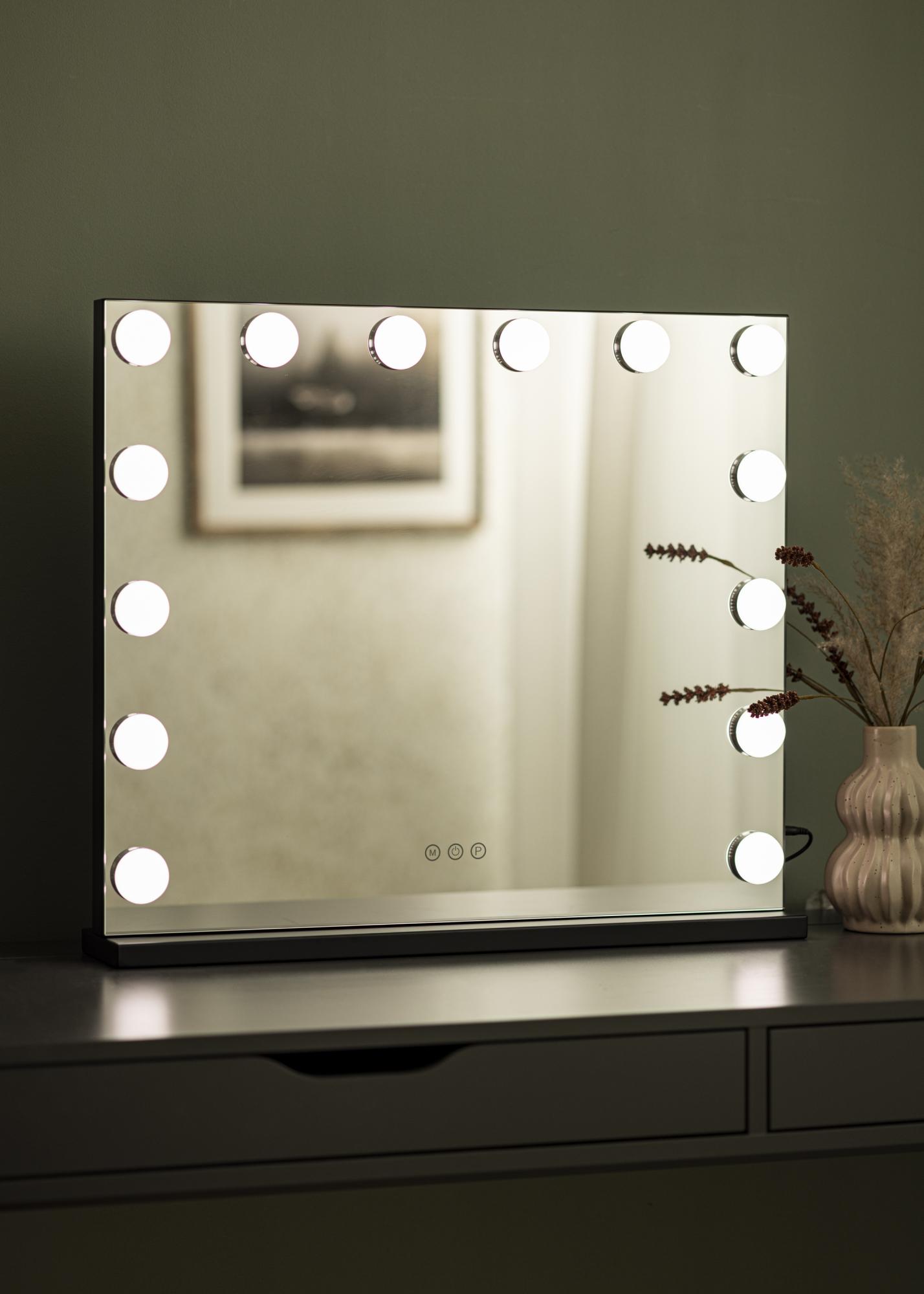 A large makeup mirror is just as much a stylish decor detail as it is a practical item that helps you get ready for the day ahead. This model has a 65x56.5 cm mirror which is framed by 14 LED bulbs that emit light in the range 3000K-6000K. The mirror has a stylish design with distinctive lighting and a black stand. If you wish to mount the mirror on the wall, the stand can be easily removed.