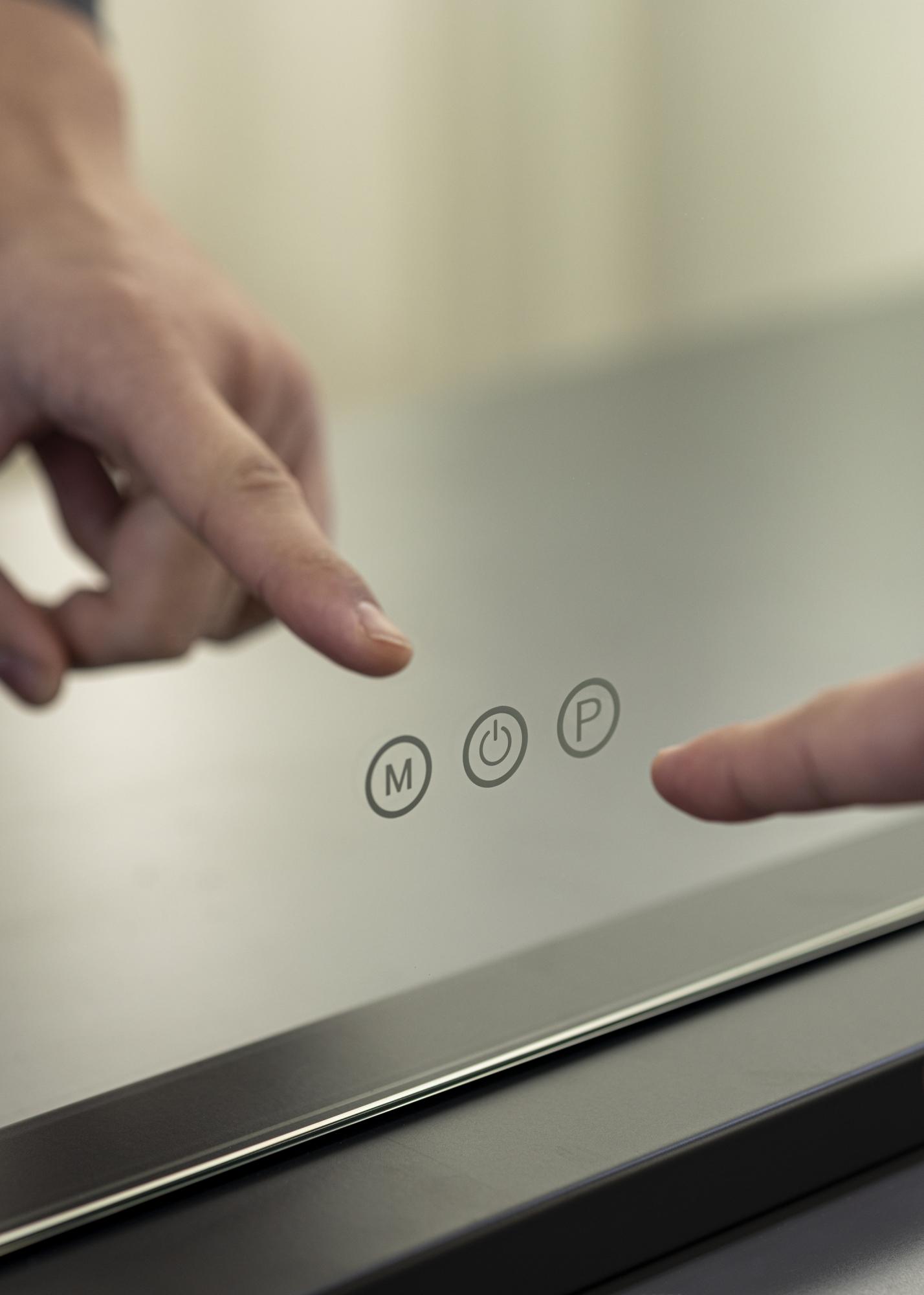 Using the touch buttons on the front of the mirror, you can turn the lighting on or off, change the colour temperature and dim the lighting to a brightness that suits you. When applying makeup, a brighter setting is more helpful but you may prefer a softer setting when using your mirror as background lighting. The light settings are accessed using the "M" and "P" buttons. "M" allows you to select the colour temperature and "P" adjusts the brightness. There are three colour temperatures to choose from; warm, cool and natural light. The mirror is powered using a plug.