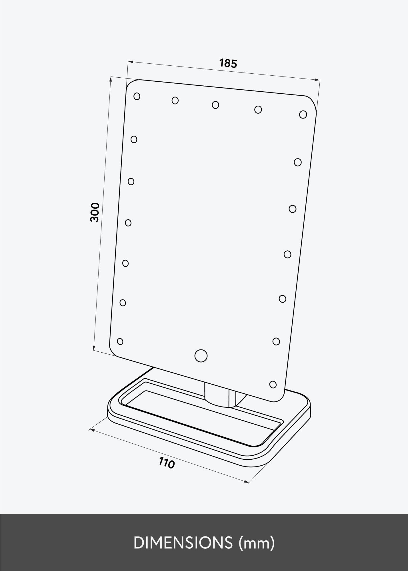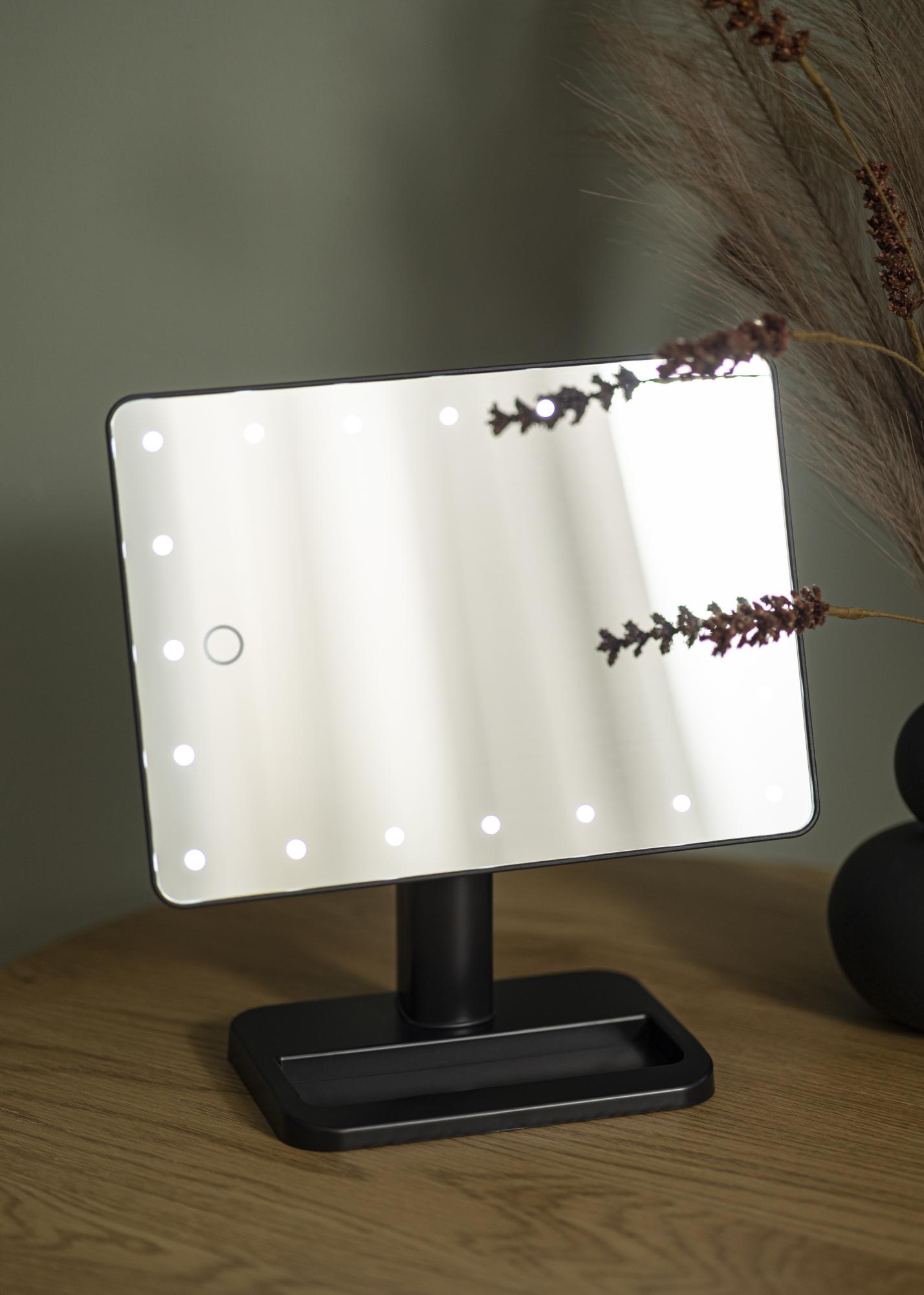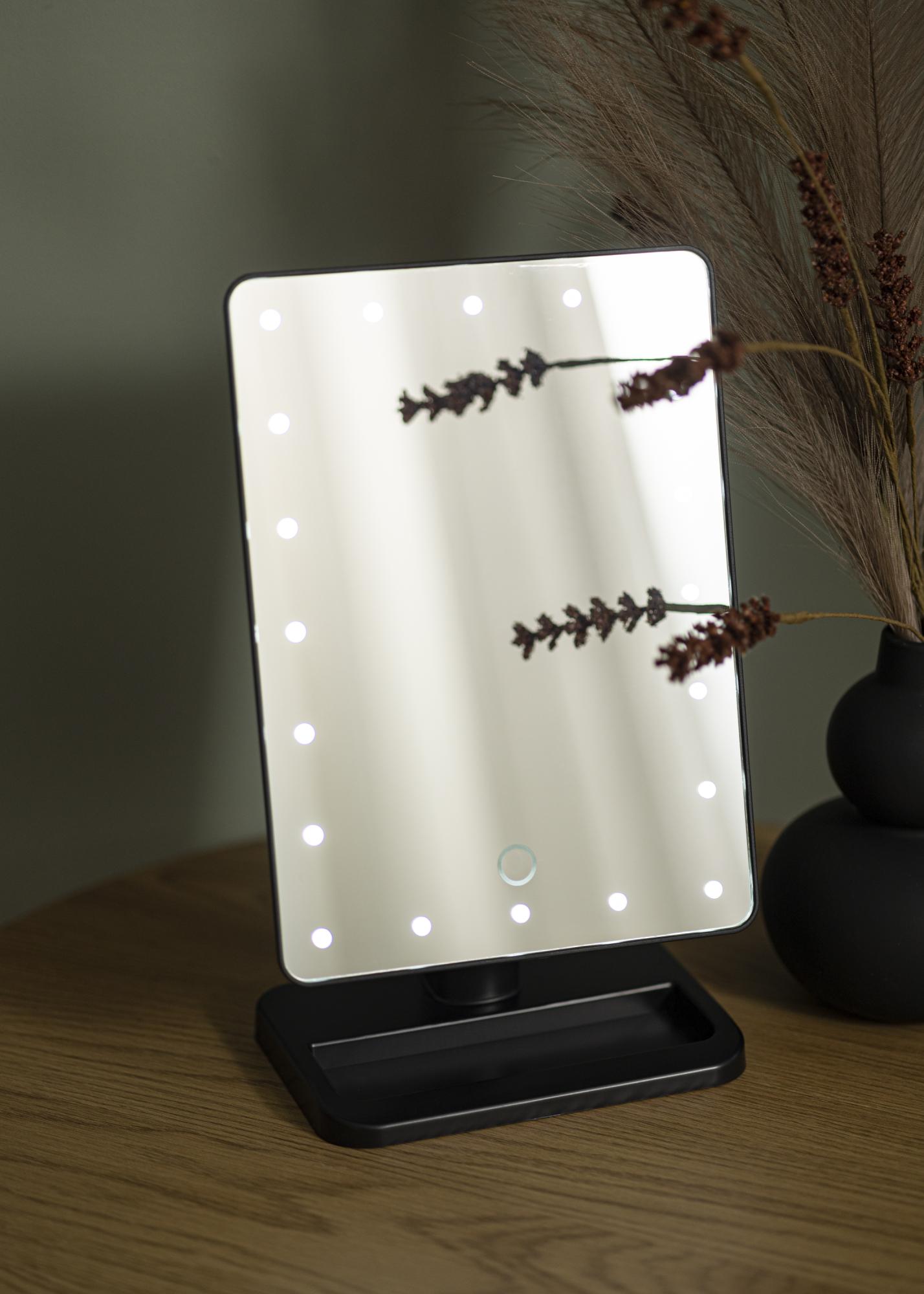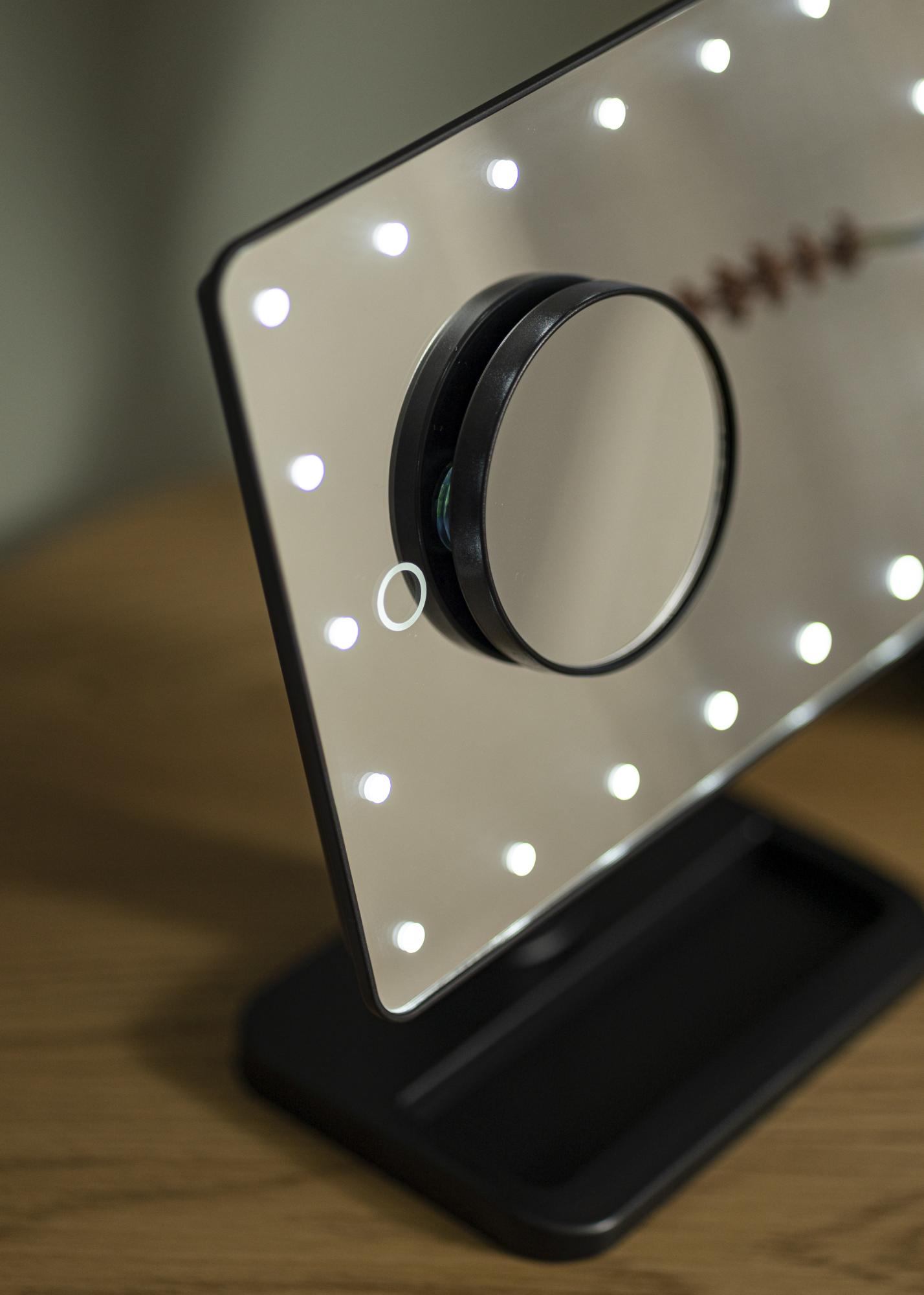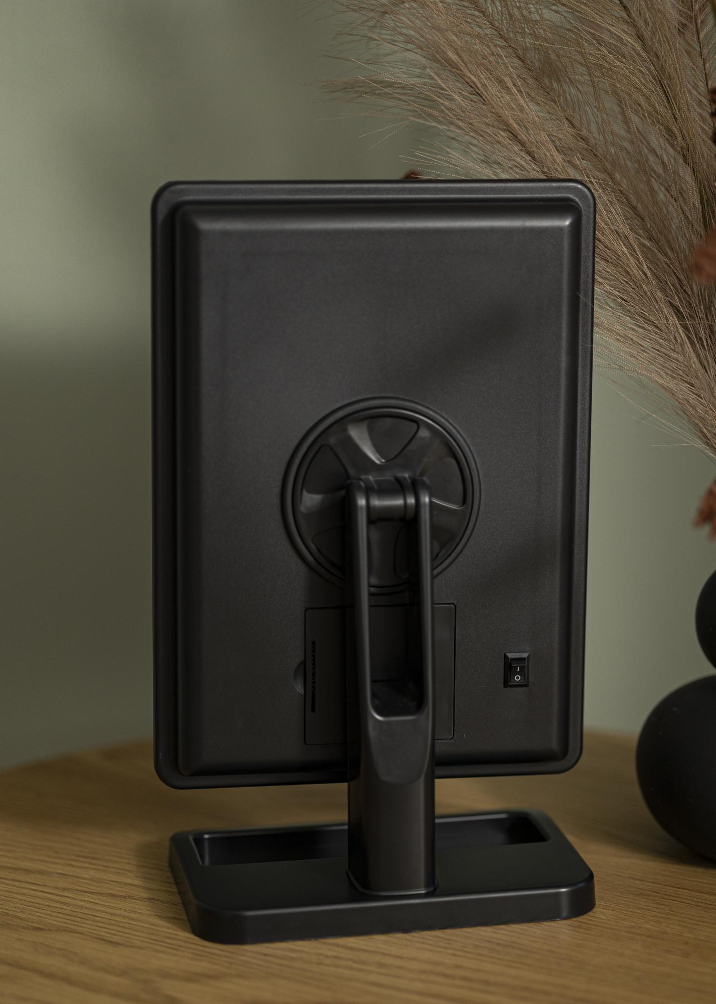Compact design, great style and balanced lighting - Foot Black gives you everything you could want in a makeup mirror! The 16.5x25 cm large mirror surface has LED lighting around the edges providing a light source that is both energy-efficient and long-lasting. To turn the lights on, use the button located on the back of the mirror. The brightness is adjusted by holding down the touch button on the front of the mirror for a few seconds.