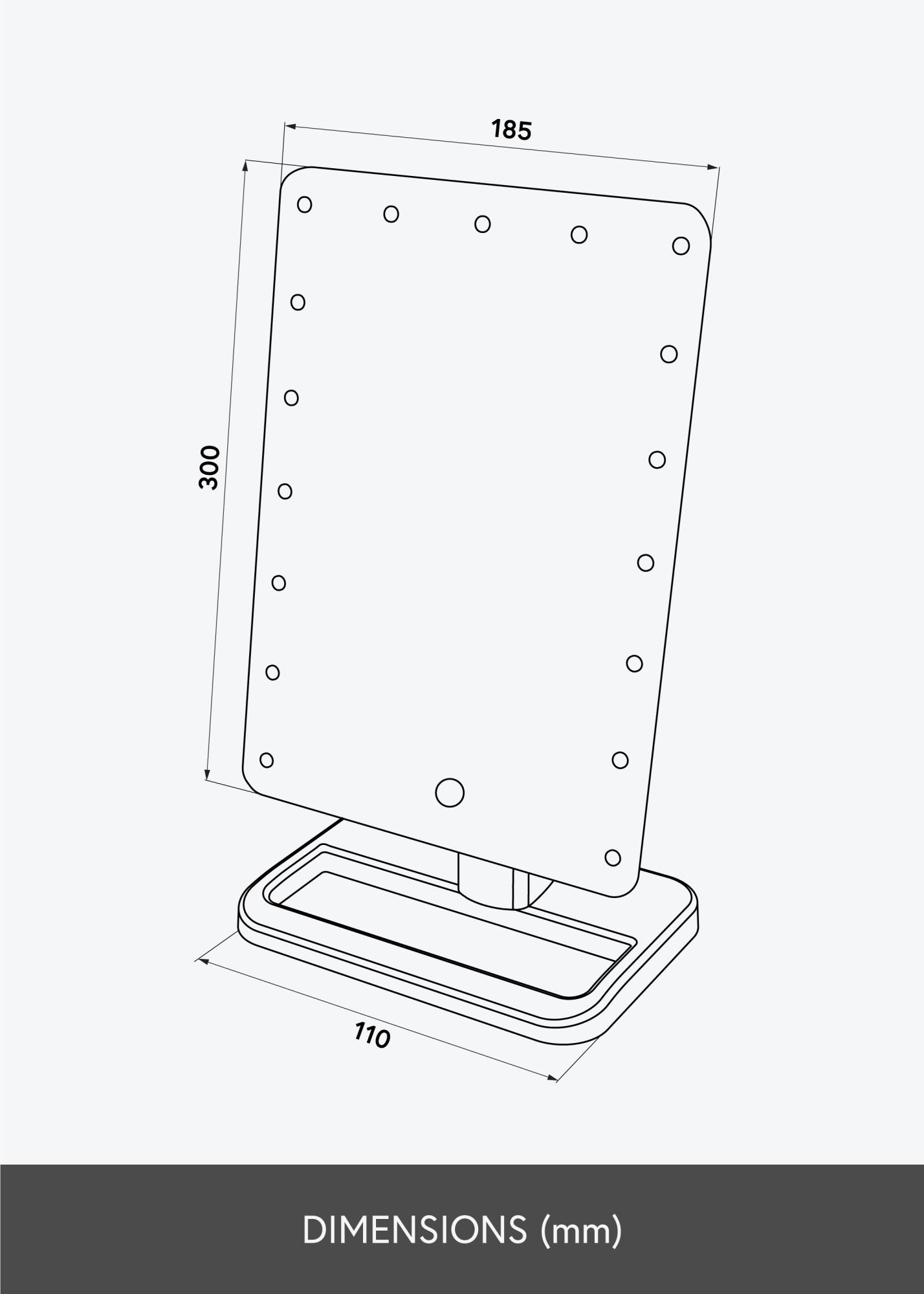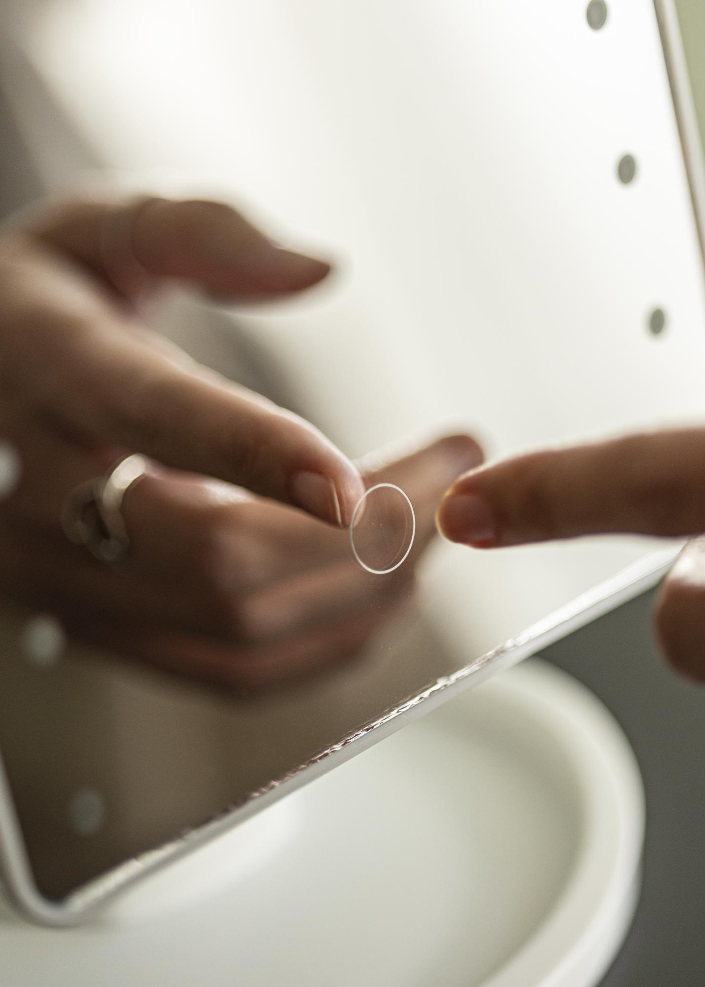The mirror surface is framed by LED lighting which gives you well balanced, even light when you apply your makeup. LED lighting benefits from being energy efficient and long lasting. You turn on the mirror using the button on the back and adjust the brightness by holding down the touch button on the front of the mirror for a few seconds. The mirror is battery operated and powered by 4x AA batteries which can be purchased separately.