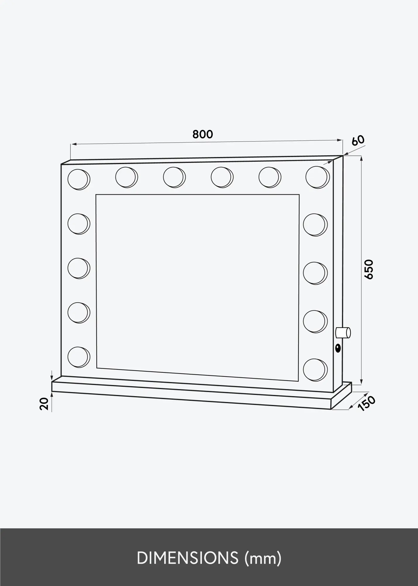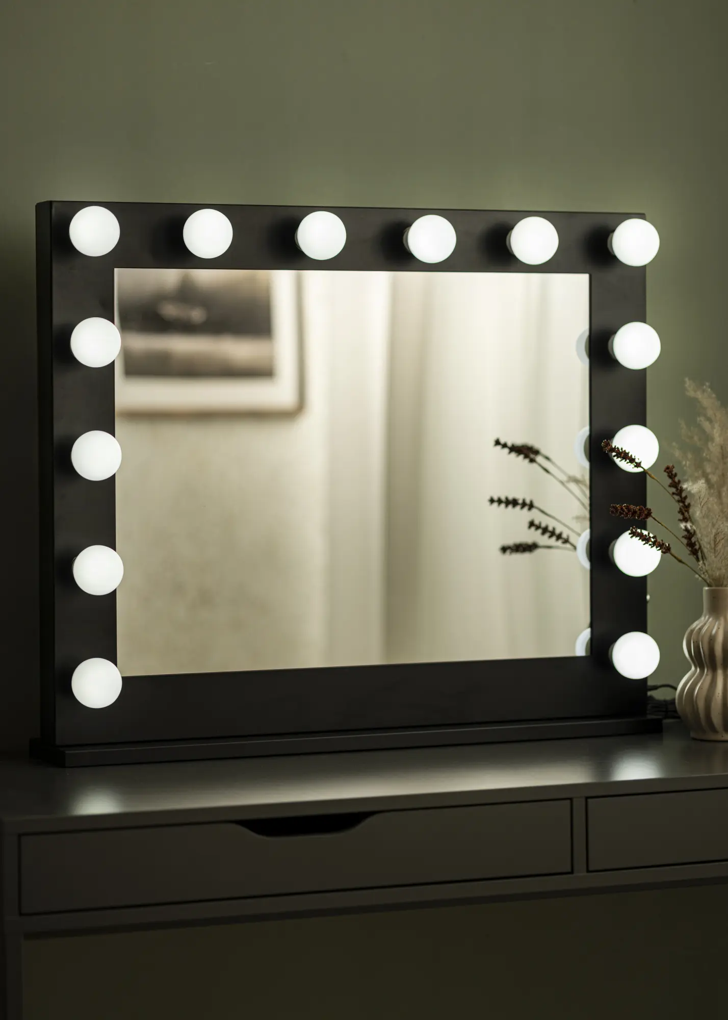 Tá sé deartha ag an stíl Hollywood galánta, atá chun áilleacht a thabhairt do do chúinne áilleacht nó do seomra suí. Tá an scáthán seo feistithe le soilsiú comhoiriúnaithe i bhfoirm 14 lampa in-athsholáthair atá suite ar chreat scátháin dhubh. Tá na lampaí in-athsholáthair agus tá bun E27 acu. Taispeánann an solas solas bán fuar. Ar thaobh amháin den scáthán, tá rialóir rothlach atá in ann an solas a laghdú go dtí an neart atá uait.